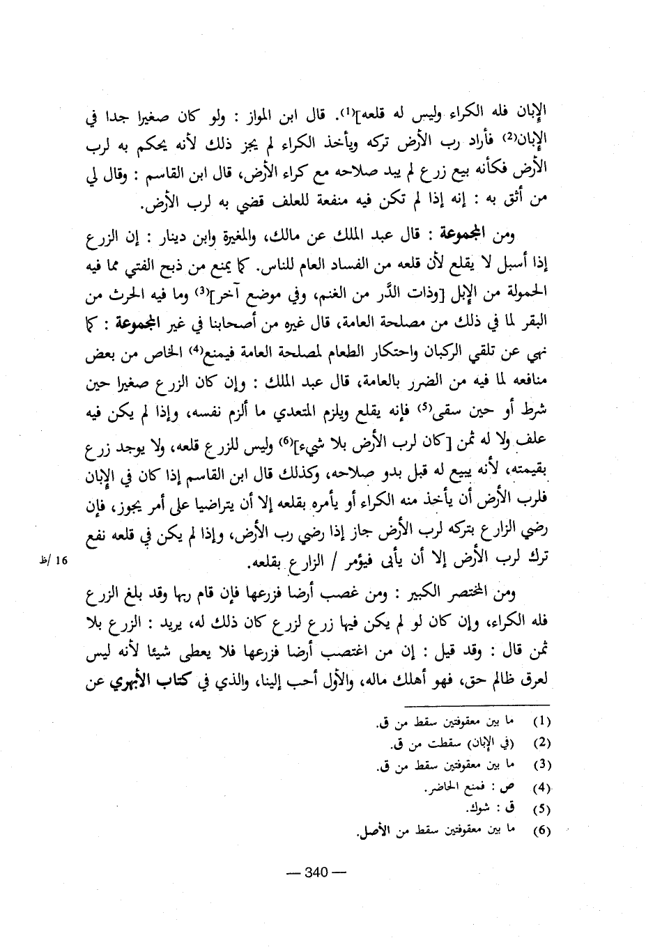 ومن المجموعة: قال عبد الملك عن مالك، والمغيرة وابن دينار: إن الزرع إذا أسبل لا يقلع لأن قلعه من الفساد العام للناس. كما يمنع من ذبح الفتي مما فيه الحمولة من الإبل [وذات الدر من الغنم، وفي موضع آخر] وما فيه الحرث من البقر لما في ذلك من مصلحة العامة، قال غيره من أصحابنا في غير المجموعة: كما نهي عن تلقي الركبان واحتكار الطعام لمصلحة العامة فيمنع الخاص من بعض منافعه لما فيه من الضرر بالعامة، قال عبد الملك: وإن كان الزرع صغيرا حين شرط أو حين سقى فإنه يقلع ويلزم المتعدي ما ألزم نفسه، وإذا لم يكن فيه علف ولا له ثمن [كان لرب الأرض بلا شيء] وليس للزرع قلعه، ولا يوجد زرع بقيمته، لأنه يبيع له قبل بدو صلاحه، وكذلك قال ابن القاسم إذا كان في الإبان فلرب الأرض أن يأخذ منه الكراء أو يأمره بقلعه إلا أن يتراضيا على أمر يجوز، فإن رضي الزارع بتركه لرب الأرض جاز إذا رضي رب الأرض، وإذا لم يكن فيه قلعه نفع ترك لرب الأرض إلا أن يأبى فيؤمر/الزارع بقلعه.