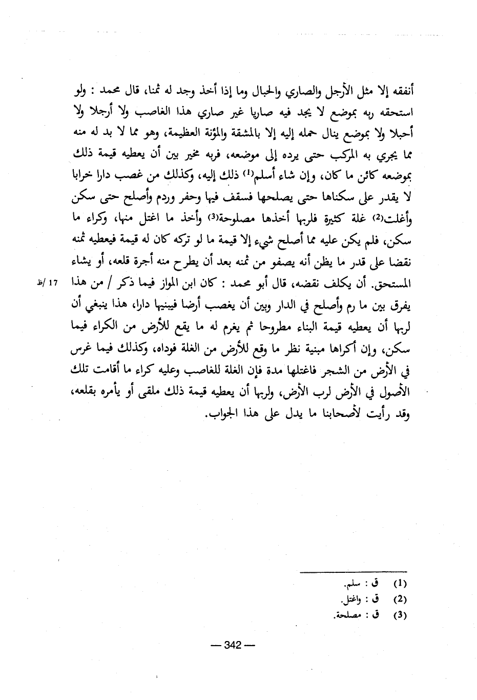 أنفقه إلا مثل الأرجل والصاري والحبال وما إذا أخذ وجد له ثمنا، قال محمد: ولو استحقه ربه بموضع لا يجد فيه صاريا غير صاري هذا الغاصب ولا أرجلا ولا أحبلا ولا بموضع ينال حمله إليه إلا بالمشقة والمؤنة العظيمة، وهو مما لا بد له منه مما يجري به المركب حتى يرده إلى موضعه، فربه مخير بين أن يعطيه قيمة ذلك بموضعه كائن ما كان، وأن شاء أسلم ذلك إليه، وكذلك منغصب دارا خرابا لا يقدر على سكناها حتى يصلحها فسقف فيها وحفر وردم وأصلح حتى سكن وأغلت غلة كثيرة فلربها أخذها مصلوحة وأخذ ما اغتل منها، وكراء ما سكن، فلم يكن عليه مما أصلح شيء إلا قيمة ما لو تركه كان له قيمة فيعطيه ثمنه نقضا على قدر ما يظن أنه يصفو من ثمنه بعد أن يطرح منه أجرة قلعه، أو يشاء المستحق. أن يكلف نقضه، قال أبو محمد: كان ابن المواز فيما ذكر/من هذا يفرق بين ما رم وأصلح في الدار وبين أن يغصب أرضا فيبنيها دارا، هذا ينبغي أن لربها أن يعطيه قيمة البناء مطروحا ثم يغرم له ما يقع للأرض من الكراء فيما سكن، وإن أكراها مبنية نظر ما وقع للأرض من الغلة فوداه، وكذلك فيما غرس في الأرض من الشجر فاعتلها مدة الغلة للغاصب وعليه كراء ما أقامت تلك الأصول في الأرض لرب الأرض، ولربها أن يعطيه قيمة ذلك ملقى أو يأمره بقلعه، وقد رأيت لأصحابنا ما يدل على هذا الجواب.