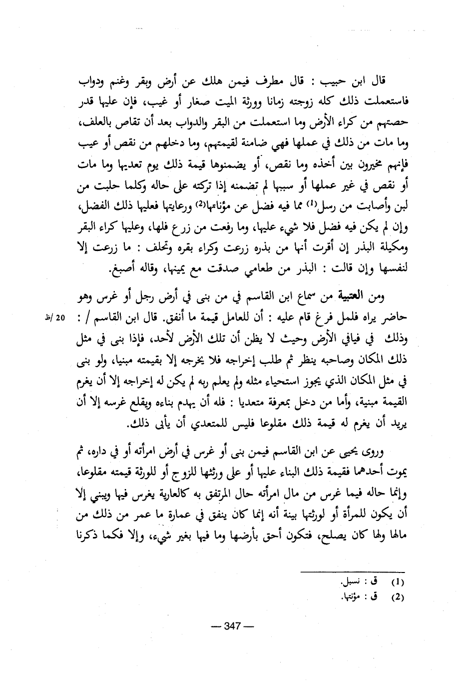 قال ابن حبيب: قال مطرف فيمن هلك عن أرض وبقر وغنم ودواب فاستعملت ذلك كله زوجته زمانا وورثة الميت صغار أوغيب، فإن عليها قدر حصتهم من كراء الأرض وما استعملت من البقر والدواب بعد أن تقاص بالعلف، وما مات من ذلك في علمها فهي ضامنة لقيمتهم، وما دخلهم من نقص أو عيب فإنهم مخيرون بين أخذه وما نقص، أو يضمنوها قيمة ذلك يوم تعديها وما مات أو نقص في غير عملها أو سببها لم يضمنه إذا تركته على حاله وكلما حلبت من لبن وأصابت من رسل مما فيه فضل عن مؤناتها ورعايتها فعليها ذلك الفضل، وإن لم يكن فيه فضل فلا شيء عليها، وما رفعت من زرع فلها، وعليها كراء البقر ومكيلة البذر إن أقرت أنها من بذرة زرعت وكراء بقره وتحلف: ما زرعت إلا لنفسها وإن قالت: البذر من طعامي صدقت مع يمينها، وقاله أصبغ.