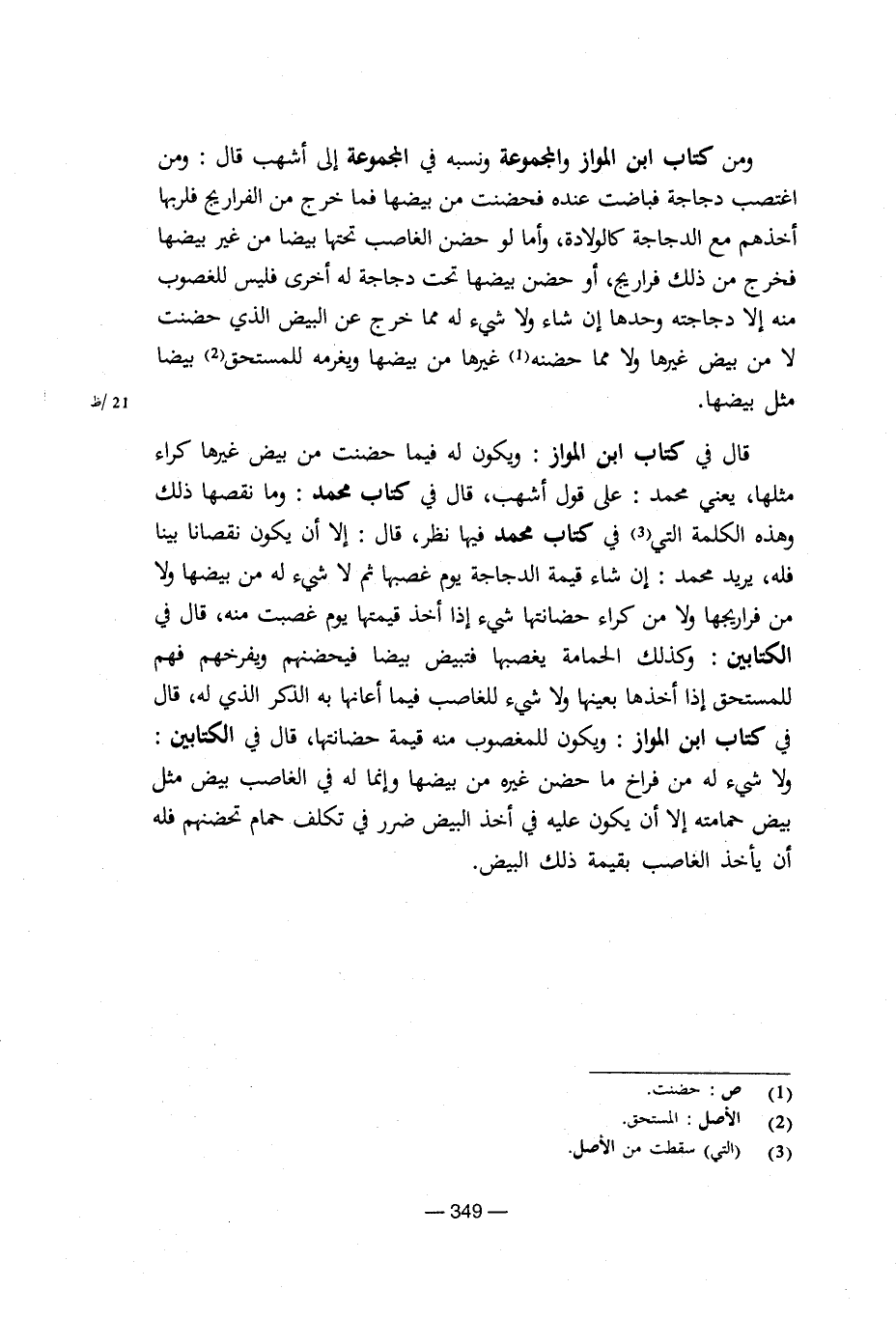 قال في كتبا ابن المواز: ويكون له فيما حضنت من بيض غيرها كراء مثلها، يعني محمد: على قول أشهب، قال في كتاب محمد: وما نقصها ذلك وهذه الكلمة التي في كتاب محمد فيها نظر، قال: إلا أن يكون نقصانا بينا فله، يريد محمد: إن شاء قيمة الدجاجة يوم غصبها ثم لا شيء له من بيضها لا من فراريجها ولا من كراء حضانتها شيء أذا أخذ قيمتها يوم غصت منه، قال في الكتابين: وكذلك الحمامة بعينها ولا شيء للغاصب فيما أعانها به الذكر الذي له، قال في كتاب ابن المواز: ويكون للمغصوب منه قيمة حضانتها، قال في الكتابين: ولا شيء له من فراخ ما حضن غيره من بيضها وإنما له في الغاصب بيض مثل بيض حمامته إلا أن يكون عليه في أخذ البيض ضرر في تكلف حمام تحضنهم فله أن يأخذ الغاصب بقيمة ذلك البيض.
