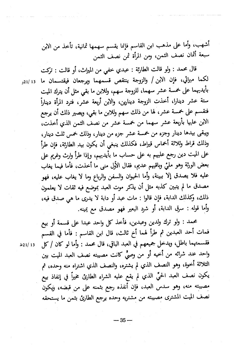 قال محمد: ولو قالت الطارئة: عبدي خفي من الميراث، أو قالت: تركت لكما ميراثي، فإن الابن/والزوجة ينتقص قسمهما ويرجعان فيقتسمان ما بأيديهما على خمسة عشر سهما، للزوجة سهم، وللابن ما بقي مثل أن يترك الميت ستة عشر دينارا، أخذت الزوجة دينارين، والابن أربعة عشر، فترد المرأة دينارا فتقسم على خمسة عشر، لها من ذلك سهم وللابن ما بقي، ويصير ذلك أن يرجع الابن عليها بأربعة عشر مهما من خمسة عشر من نصف الثمن الذي أخذت، ويبقي بيدها دينار وجزء من خمسة عشر جزء من دينار، وذلك خمس ثلث دينار، وذلك قراط وثلاثة أخمسا قيراط، فكذلك ينبغي أن يكون بيد الطارئة، فإن طرأ على الميت دين رجع عليهم به على حساب ما بأيديهم، وإذا طرأ وارث وغريم على بعض الورثة وهو ملئ وباقيهم عديم، فقال الأول منى ما أخذت، فأما فيما يغاب عليه فلا يصدق إلا ببينة، وأما الحيوان والسفن والرباع وما لا يغاب عليه، فهو مصدق ما لم يتبين كذبه مثل أن يذكر موت العبد بموضع فيه ثقات لا يعملون ذلك، وكذلك الدابة، فإن قالوا: مات عبد أو دابة لا يدري ما هي صدق فيه، وأما قوله: سرق الدابة، أو شرد البعير فهو مصدق مع يمينه.