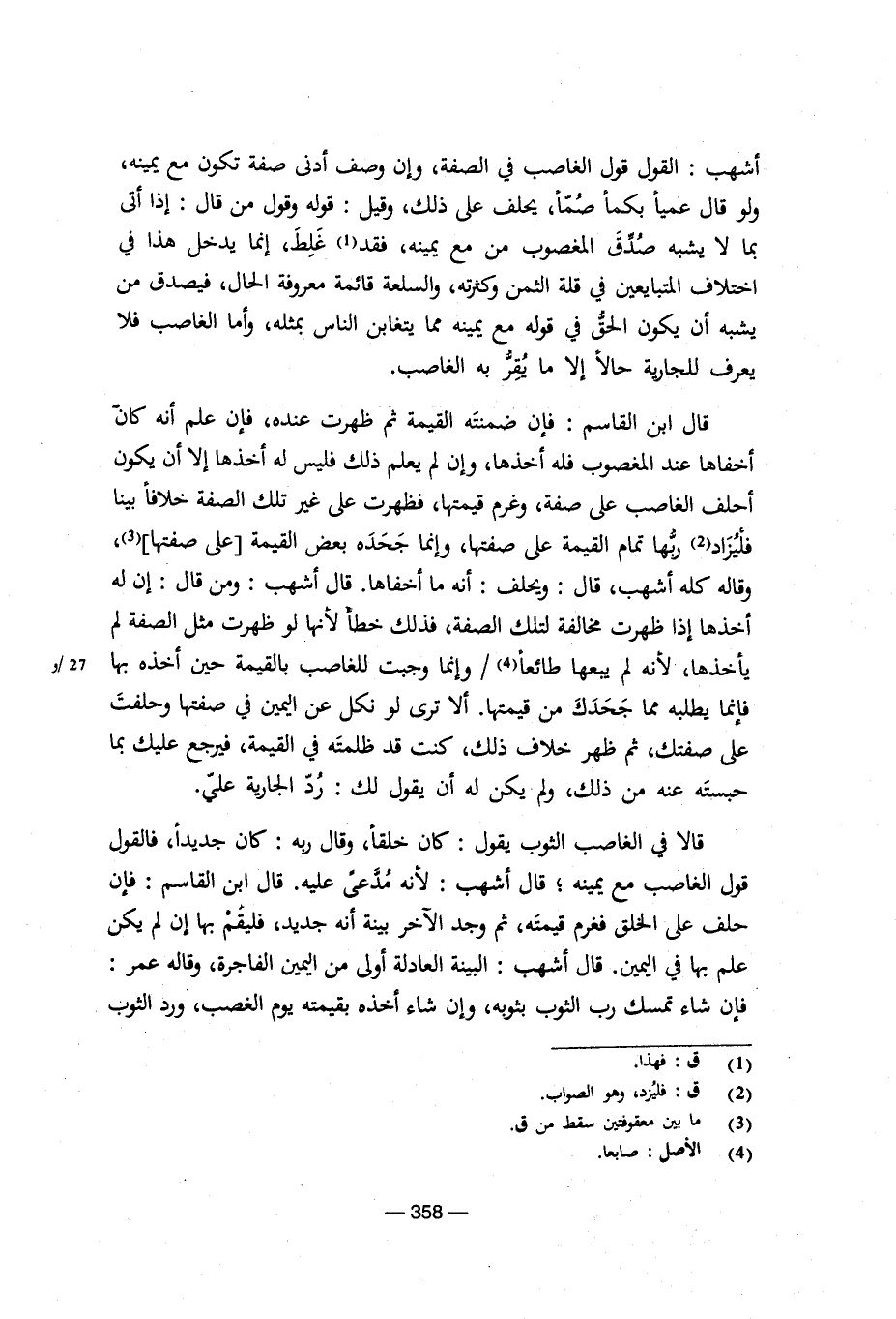 أشهب: القول قول الغاصب في الصفة، وإن وصف أدن صفة تكون مع يمينه، ولو قال عميا بكما صما، يحلف على ذلك، وقيل: قوله وقول من قال: إذا أتى بما لا يشبه صدق المغصوب من مع يمينه، فقد غلط، إنما يدخل هذا في اختلاف المتبايعين في قلة الثمن وكثرته، والسلعة قائمة معروفة الحال، فيصدق من يشبه أن يكون الحق في قوله مع يمينه مما يتغابن الناس بمثله، وأما الغاصب فلا يعرف للجارية حالا إلا ما يقر به الغاصب.