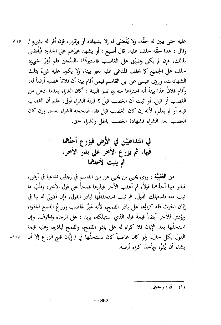 عليه حتى يبين له حقه، ولا يقضى له بشهادة أو بإقرار، فإن أقر له بشيء/وقال: هذا حقه حلف عليه. قال اصبغ. أو يشهد غيرهم على الحدود فيقضى بذلك، فإن لم يكن وضيق على الغاصب فاستبرأ بالسجن فلم يقر بشيء، حلف على الجميع كما يحلف المدعى عليه بغير بينة، ولا يكون عليه شيء بتلك الشهادات، وروى عيسى عن ابن القاسم فيمن أقام بينة أن فلانا غصبه أرضا له، وأقام فلان هذا بينة أنه اشتراها منه ولم تدر البينة: أكان الشراء بعدما ادعى من الغصب أو قبل، أو ثبت أن الغصب قبل؟ فبينة الشراء أولى، علم أن الغصب قبله أو لم يعلم، لأنه إن كان الغصب قبل فقد صححه الشراء بعده. وإن كان الغصب بعد الشراء فشهادة الغصب باطل والشراء حق.