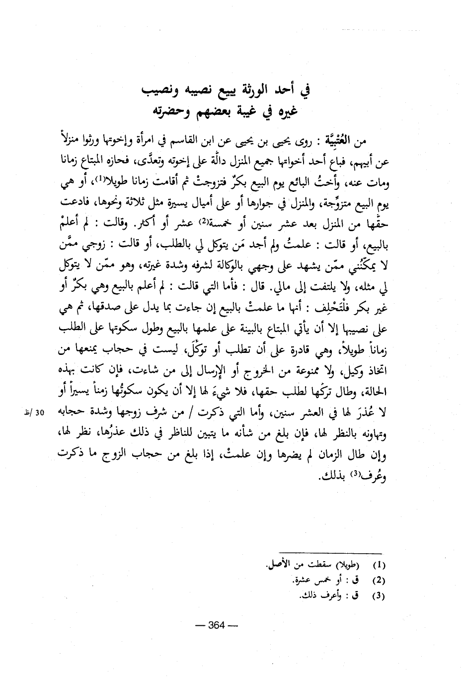 من العتبية: روى يحيى بن يحيى عن ابن القاسم في امرأة وإخوتها ورثوا منزلا عن أبيهم، فباع أحد أخواتهم جميع المنزل دالة على إخوته وتعدى، فحازه المبتاع زمانا ومات عنه، وأخت البائع يوم البيع بكر فتزوجت ثم أقامت زمانا طويلا، أو هي يوم البيع متزوجة، والمنزل في جوارها أو على أميال يسيرة مثل ثلاثة ونحوها، فادعت حقها من المنزل بعد عشر سنين أو خمسة عشر. أو أكثر. وقالت: لم أعلم بالبيع، أو قالت: علمت ولم أجد من يتوكل لي بالطلب، أو قالت: زوجي ممن لا يمكنني ممن يشهد على وجهي بالوكالة لشرفه وشدة غيرته، وهو ممن لا يتوكل لي مثله، ولا يلتفت إلى مالي. قال: فأما التي قالت: لم أعلم بالبيع وهي بكر أو غير بكر فلتحلف: أنها ما علمت بالبيع إن جاءت بما يدل على صدقها، ثم هي على نصيبها إلا أن يأتي المبتاع بالبينة على علمها بالبيع وطول سكوتها على الطلب زمانا طويلا، وهي قادرة على أن تطلب أو توكل، ليست في حجاب يمنعها من اتخاذ وكيل، ولا ممنوعة من الخروج أو الإرسال إلى من شاءت، فإن كانت بهذه الحالة، وطال تركها لطلب حقها، فلا شيء لها إلا أن يكون سكوتها زمنا يسيرا أو لا عذر لها في العشر سنين، وأما التي ذكرت/من شرف زوجها وشدة حجابه وتهاونه بالنظر لها، فإن بلغ من شأنه ما يتبين للناظر في ذلك عذرها، نظر لها، وإن طال الزمان لم يضرها وإن علمت، إذا بلغ من حجاب الزوج ما ذكرت وعرف بذلك.