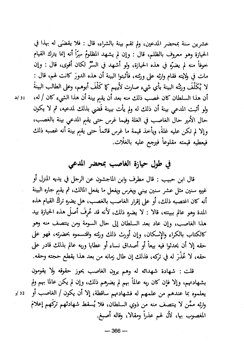 عشرين سنة بمحضر المدعين، ولم تقم بينة بالشراء، قال: فلا يقضى له بهذا في الحيازة وهو معروف بالظلم، قال: وإن لم يشهد المظلوم سرا أنه إنما يترك القيام خوفا منه لم يضره في هذه الحيازة، ولو أشهد في السر لكان أقوى، قال: وإن مات في ولايته فقام وارثه على ورثته، فأثبتوا البينة أن هذه الدور كانت لهم، قال: لا يكلف ورثته البينة بأي شيء صارت لأبيهم كما كلف أبوهم، وعلى الطالب البينة أن هذا السلطان كان غصب ذلك منه بعد أن يقيم بينة أن هذا الشيء كان/له، ولو أثبت المدعي بينة أن ذلك له ولم يأت ببينة قضى بذلك لمدعية، ثم لا يكون حال الأمير حال الغاصب في الغلة وفيما غرس حتى يقيم المدعي بينة الغصب، وإلا لم تكن عليه غلة، ويأخذ قيمة ما غرس قائما حتى يقيم بينة أنه غصبه ذلك فيعطيه قيمته مقلوعا فيرجع عليه بالغلات.
