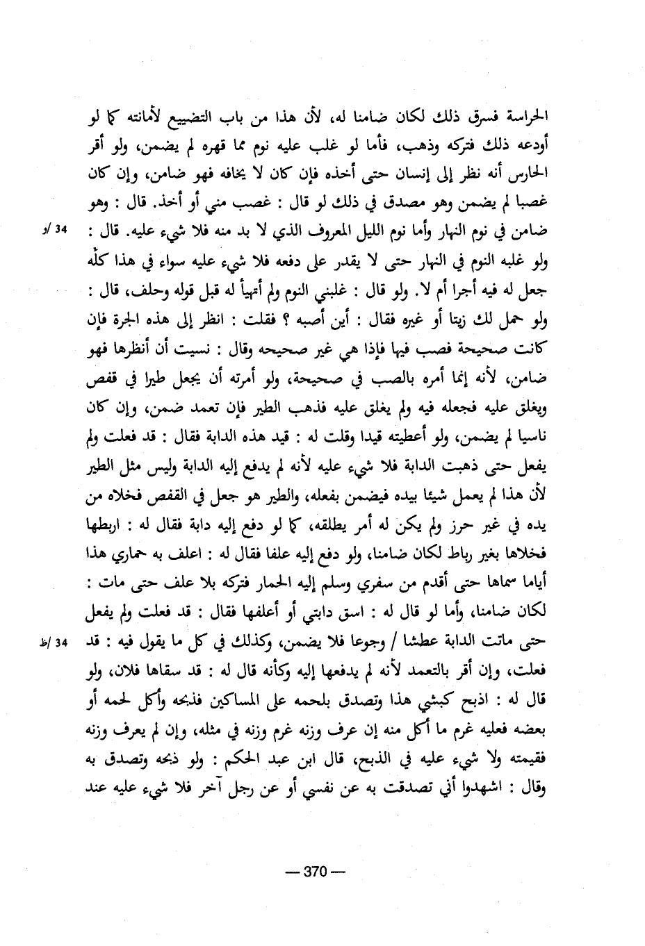 الحراسة فسرق ذلك لكان ضامنا له، لأن هذا من باب التضييع لأمانته كما لو اودعه ذلك فتركه وذهب، فأما لو غلب عليه نوم مما قهره لم يضمن، ولو أقر الحارس أنه نظر إلى إنسان حتى أخذه فإن كان لا يخافه فهو ضامن، وإن كان غصبا لم يضمن وهو مصدق في ذلك لو قال: غصب مني أو أخذ. قال: وهو ضامن في نوم النهار وأما الليل المعروف الذي لا بد منه فلا شيء عليه. قال: ولو غلبه النوم في النهار حتى لا يقدر على دفعه فلا شيء عليه سواء في هذا كله جعل له فيه أجرا أم لا. ولو قال: غلبني النوم ولم أتهيأ له قبل قوله وحلف، قال: ولو حمل لك زيتا أو غيره فقال: أين أصبه؟ فقلت: انظر إلى هذه الجرة فإن كانت صحيحة فصب فيها فإذا هي غير صحيحة وقال: نسيت أن أنظرها فهو ضامن، لأنه إنما أمره بالصب في صحيحة، ولو أمرته أن يجعل طيرا في قفص ويغلق عليه فجعله فيه ولم يغلق عليه فذهب الطير فإن تعمد ضمن، وإن كان ناسيا لم يضمن، ولو أعطيته قيدا وقلت له: قيد هذه الدابة فقال: قد فعلت ولم يفعل حتى ذهبت الدابة فلا شيء عليه لأنه لم يدفع إليه الدابة وليس مثل الطير لأن هذا لم يعمل شيئا بيده فيضمن بفعله، والطير هو جعل في القفص فخلاه من يده في غير حرز ولم يكن له أمر يطلقه، كما لو دفع إليه دابة فقال له: اربطها فخلافا بغير رباط لكان ضامنا، ولو دفع إليه علفا فقال له: اعلف به حماري هذا أياما سماها حتى أقدم من سفري وسلم إليه الحمار فتركه بلا علف حتى مات لكان ضامنا، وأما لو قال له: اسق دابتي أو أعلفها فقال: قد فعلت ولم يفعل حتى ماتت الدابة عطشا/وجوعا فلا يضمن، وكذلك في كل ما يقول فيه: قد فعلت، وإن اقر بالتعمد لأنه لم يدفعها إليه وكأنه قال له: قد سقاها فلان، ولو قال له: اذبح كبشي هذا وتصدق بلحمه على المساكين فذبحه وأكل لحمه أو بعضه فعليه غرم ما أكل منه إن عرف وزنه غرم وزنه في مثله، وإن لم يعرف وزنه فقيمته ولا شيء عليه في الذبح، قال ابن عبد الحكم: ولو ذبحه وتصدق به وقال: اشهدوا أني تصدقت به عن نفسي أو عن رجل آخر فلا شيء عليه عند