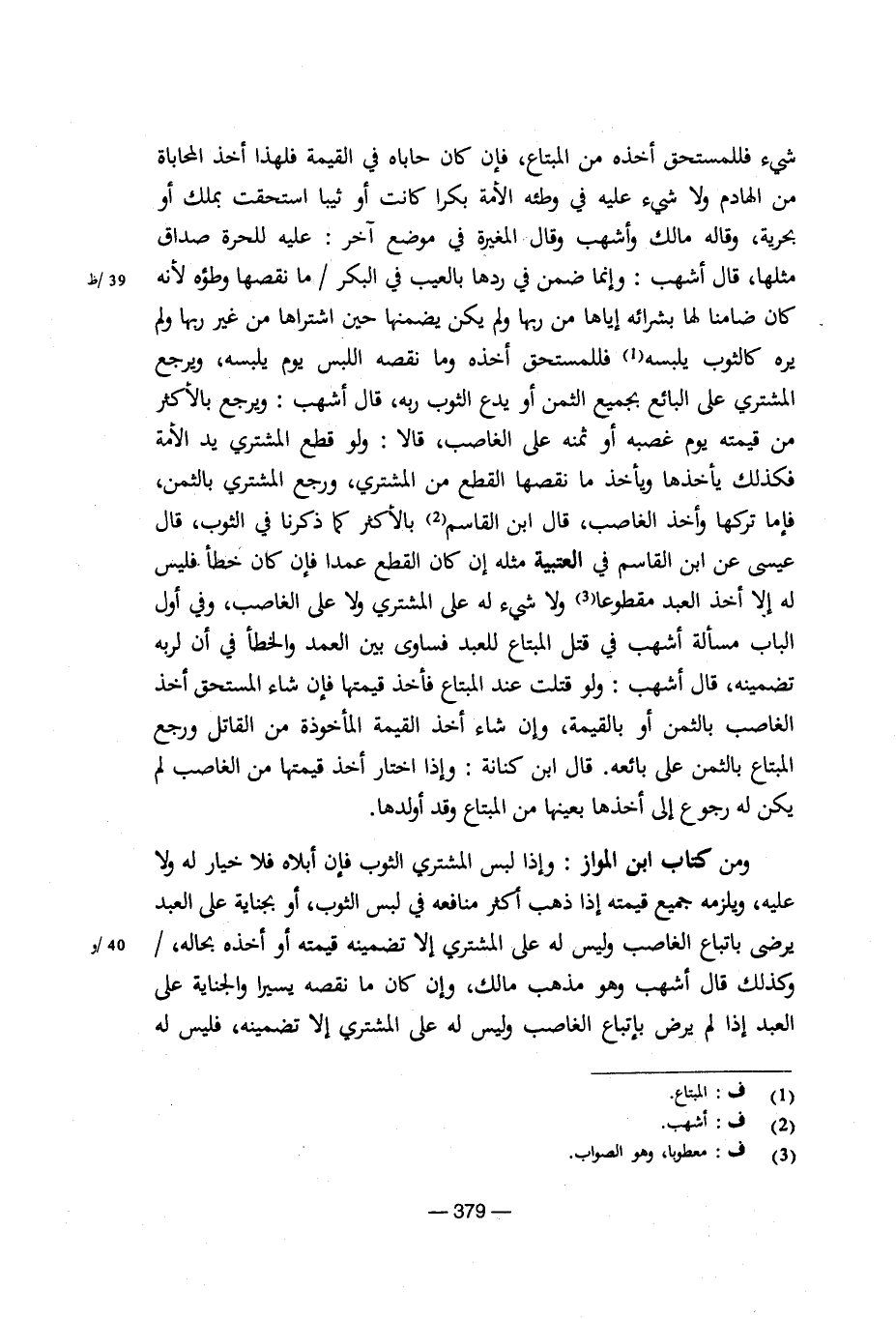 ومن كتاب ابن المواز: وإذا لبس المشتري الثوب فإن أبلاه فلا خيار له ولا عليه، ويلزمه جميع قيمته إذا ذهب أكثر منافعه في لبس الثوب، أو بجناية على العبد يرضى باتباع الغاصب وليس له على المشتري إلا تضمينه قيمته أو أخذه بحاله،/وكذلك قال أشهب وهو مذهب مالك، وإن كان ما نقصه يسيرا والجناية على العبد إذا لم يرض بإتباع الغاصب وليس له على المشتري إلا تضمينه، فليس له