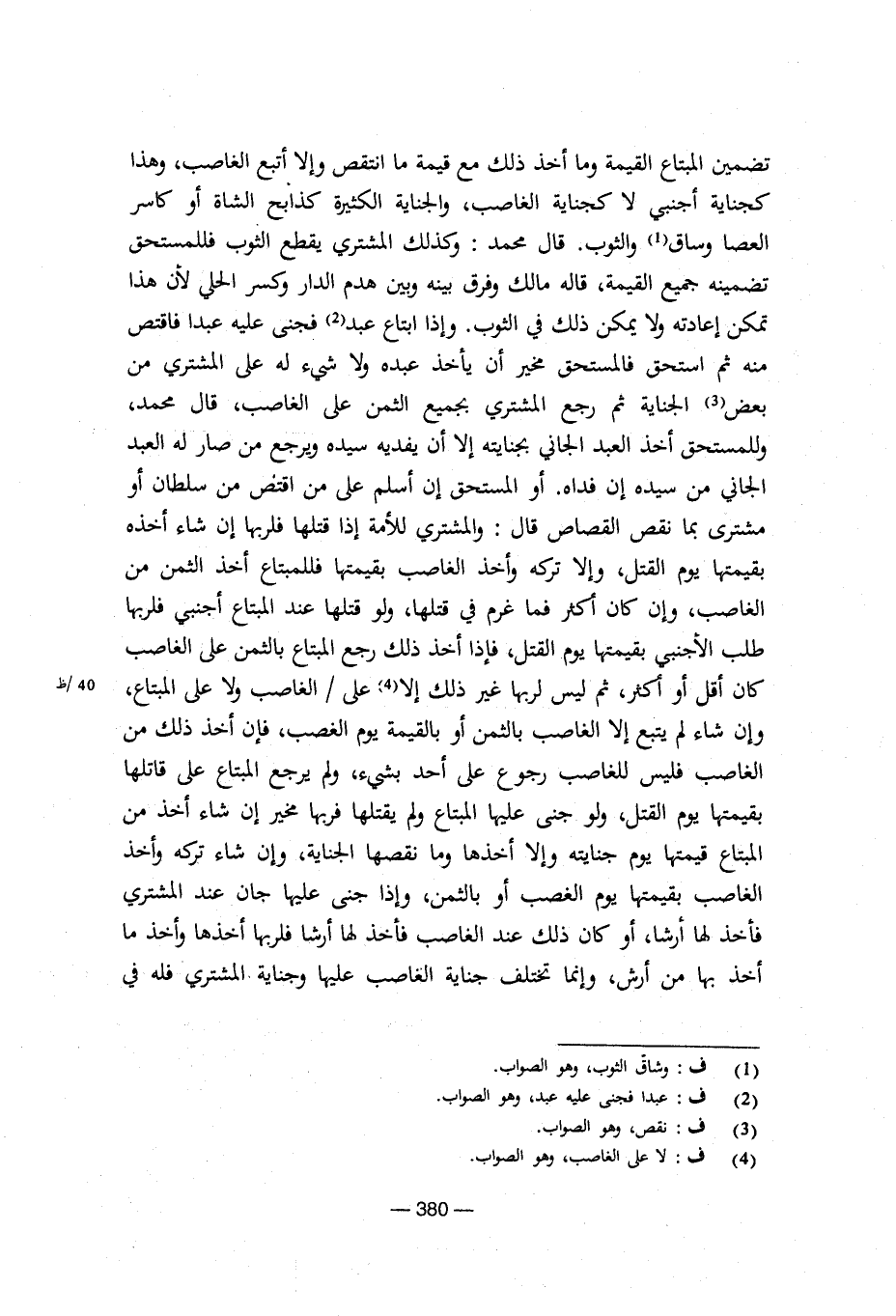 تضمين المبتاع القيمة وما أخذ ذلك مع قيمة ما انتقص وإلا أتبع الغاصب، وهذا كجناية أجنبي لا كجناية الغاصب، والجناية الكثيرة كذابح الشاة أو كاسر العصا وساق والثوب. قال محمد: وكذلك المشتري يقطع الثوب فللمستحق تضمينه جميع القيمة، قاله مالك وفرق بينه وبين هدم الدار وكسر الحي لأن هذا تمكن إعادته ولا يمكن ذلك في الثوب. وإذا ابتاع عبد فجنى عليه عبدا فاقتص منه ثم استحق فالمستحق مخير أن يأخذ عبده ولا شيء له على المشتري من بعض الجناية ثم رجع المشتري بجميع الثمن على الغاصب، قال محمد: وللمستحق أخذ العبد الجاني بجنايته إلا أن يفديه سيده ويرجع من صار له العبد الجاني من سيده إن فداه. أو المستحق إن أسلم على من اقتص من سلطان أو مشتري بما نقص القصاص قال: والمشتري للأمة وإذا قتلها فلربها إن شاء أخذه بقيمتها يوم القتل، وإلا تركه وأخذ الغاصب بقيمتها للمبتاع أخذ الثمن من الغاصب، وإن كان أكثر فما غرم في قتلها، ولو قتلها عند المبتاع أجنبي فلربها طلب الأجنبي بقيمتها يوم القتل، فإذا أخذ ذلك رجع المبتاع بالثمن على الغاصب كان أقل أو أكثر، ثم ليس لربها غير ذلك إلا على/الغاصب ولا على المبتاع، وإن شاء لم يتبع إلا الغاصب بالثمن أو بالقيمة يوم الغصب، فإن أخذ ذلك من الغاصب فليس للغاصب رجوع على أحد بشيء، ولم يرجع المبتاع على قاتلها بقيمتها يوم القتل، ولو جنى عليها المبتاع ولم يقتلها فربها مخير إن شاء أخذ من المبتاع قيمتها يوم جنايته وإلا أخذها وما نقصها الجناية، وإن شاء تركه وأخذ الغاصب بقيمتها يوم الغصب أو بالثمن، وإذا جنى عليها جان عند المشتري فأخذ لها أرشا، أو كان ذلك عند الغاصب فأخذ لها أرشا فلربها أخذها وأخذ ما أخذ بها من أرش، وإنما تختلف جناية الغاصب عليها وجناية المشتري فله في
