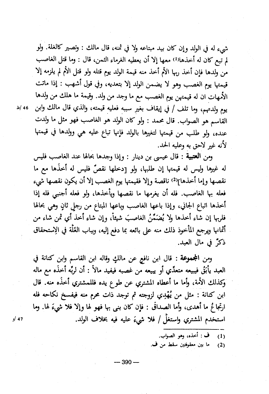 شيء له في الولد وإن كان بيد مبتاعه ولا في ثمنه، قال مالك: وتصير كالغلة. ولو لم تبع كان له أخذها معها إلا أن يعطيه الغرماء الثمن، قال: وما قتل الغاصب من ولدها فإن أخذ ربها الأم أخذ منه قيمة الولد يوم قتله ولو قتل الأم لم يلزمه إلا قيمتها يوم الغصب وهو لا يضمن الولد إلا بتعديه، وفي قول أشهب: إذا ماتت الأمهات أن له قيمتهن يوم الغصب مع ما وجد من ولد. وقيمة ما هلك من ولدها يوم ولدتهم، وما تلف/في إيقاف بغير سببه فعليه قيمته، والذي قال مالك وابن القاسم هو الصواب. قال محمد: ولو كان الولد هو الغاصب فهو مثل ما ولدت عنده، ولو طلب من قيمتها لتغيرها بالولد فإنها تباع عليه هي وولدها في قيمتها لأنه غير لاحق به وعليه الحد.