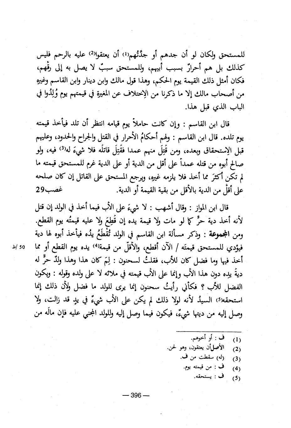 قال ابن القاسم: وإن كانت حاملا يوم قيامه انتظر أن تلد فيأخذ قيمته يوم تلده. قال ابن القاسم: ولهم أحكام الأحرار في القتل والجراح والحدود، وعليهم قبل الاستحقاق وبعده، ومن قتل منم عمدا فقتل قاتله فلا شيء له فيه، ولو صالح أبوه من قتله عمدا على أقل من الدبة أو على الدية غرم للمستحق قيمته ما لم تكن أكثر مما أخذ فلا يلزمه غيره، ويرجع المستحق على القاتل إن كان صلحه على أقل من الدية بالأقل من بقية القيمة أو الدبة. غصب 29