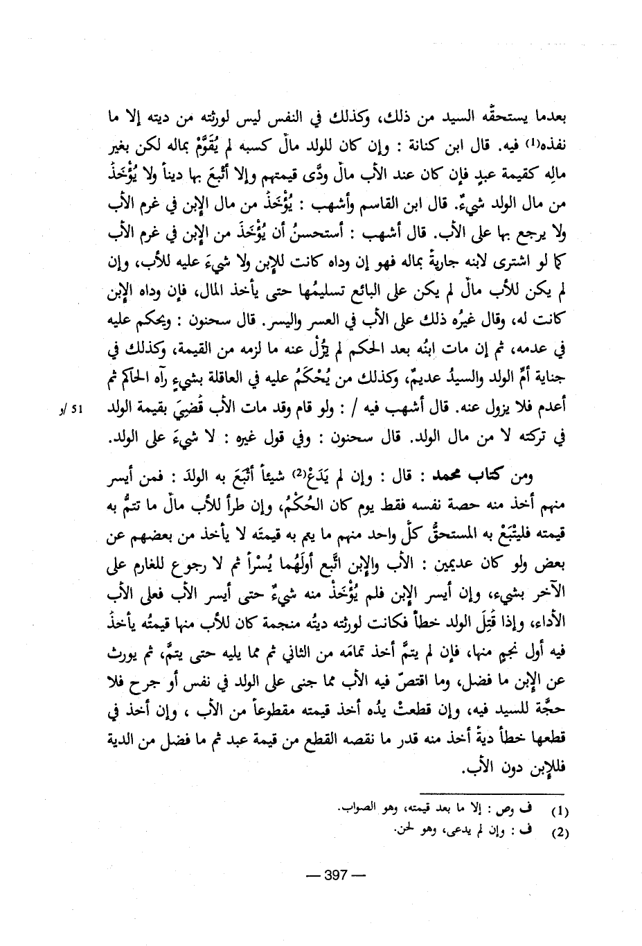 بعدما يستحقه السيد من ذلك، وكذلك في النفس ليس لورثته من ديته إلا ما نفذه فيه. قال ابن كنانة: وإن كان للولد مال كسبه لم يقوم بماله لكن بغير ماله كقيمة عبد فإن كان عند الأب مال ودي قيمتهم وإلا أتبع بها دينا ولا يؤخذ من مال الولد شيء. قال ابن القاسم وأشهب: يؤخذ من مال الابن في غرم الأب ولا يرجع بها على الأب. قال أشهب: أستحسن أن يؤخذ من الابن في غرم الأب كما لو اشترى لابنه جارية بماله فهو إن وداه كانت للابن ولا شيء عليه للأب، وإن لم يكن للأب مال لم يكن على البائع تسليمها حتى يأخذ المال، فإن وداه الابن كانت له، وقال غيره ذلك على الأب في العسر واليسر. قال سحنون: ويحكم عليه في عدمه، ثم إن مات ابنه بعد الحكم لم يزل عنه ما لزمه من القيمة، وكذلك في جناية أم الولد والسيد عديم، وكذلك من يحكم عليه في العاقلة بشيء رآه الحاكم ثم أعدم فلا يزول عنه. قال أشهب فيه/: ولو قام وقد مات الأب قضي بقيمة الولد في تركته لا من مال الولد. قال سحنون: وفي قول غيره: لا شيء على الولد.