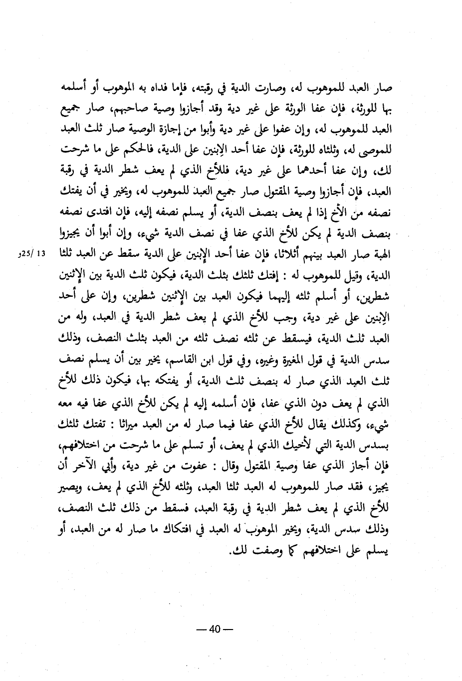 صار العبد للموهوب له، وصارت الدية في رقبته، فإما فداه به الموهوب أو أسلمه بها للوارثة، فإن عفا الورثة على غير دية وقد أجازوا وصية صاحبهم، صار جميع العبد للموهوب له، وإن عفوا على غير دية وأبوا من إجازة الوصية صار ثلث العبد للموصى له، وثلثاه للورثة، فإن عفا أحد الابنين على الدية، فالحكم على ما شرحت لك، وإن عفا أحدهما على غير دية، فللأخ الذي لم يعف شطر الدية في رقبة العبد، فإن أجازوا وصية المقتول صار جميع العبد للموهوب له، ويخير في أن يفتك نصفه من الأخ إذا لم يعف بنصف الدية، أو يسلم نصفه إليه، فإن افتدى نصفه بنصف الدية لم يكن للأخ الذي عفا في نصف الدية شيء، وإن أبوا أن يجيزوا الهبة صار العبد بينهم أثلاثا، فإن عفا أحد الابنين على الدية سقط عن العبد ثلثا الدية، وقيل للموهوب له: إفتك ثلثك بثلث الدية، فيكون ثلث الدية بين الاثنين شطرين، أو أسلم ثلثه إليهما فيكون العبد بين الاثنين شطرين، وإن على أحد الابنين على غير دية، وجب للأخ الذي لم يعف شطر الدية في العبد، وله من العبد ثلث الدية، فيسقط عن ثلثه نصف ثلثه من العبد بثلث النصف، وذلك سدس الدية في قول المغيرة وغيره، وفي قول ابن القاسم، يخير بين أن يسلم نصف ثلث العبد الذي صار له بنصف ثلث الدية، أو يفتكه بها، فيكون ذلك للأخ الذي لم يعف دون الذي عفا، فإن أسلمه إليه لم يكن للأخ الذي عفا فيه معه شيء، وكذلك يقال للأخذ الذي عفا فيما صار له من العبد ميراثا: تفتك ثلثك بسدس الدية التي لأخيك الذي لم يعف، أو تسلم على شرحت من اختلافهم، فإن أجاز الذي عفا وصية المقتول وقال: عفوت من غير دية، وأبي الآخر أن يجيز، فقد صار للموهوب له العبد ثلثا العبد، وثلثه للأخ الذي لم يعف، ويصير للأخ الذي لم يعف شطر الدية في رقبة العبد، فسقط من ذلك ثلث النصف، وذلك سدس الدية، ويخير الموهوب له العبد في افتكاك ما صار له من العبد، أو يسلم على اختلافهم كما وصفت لك.