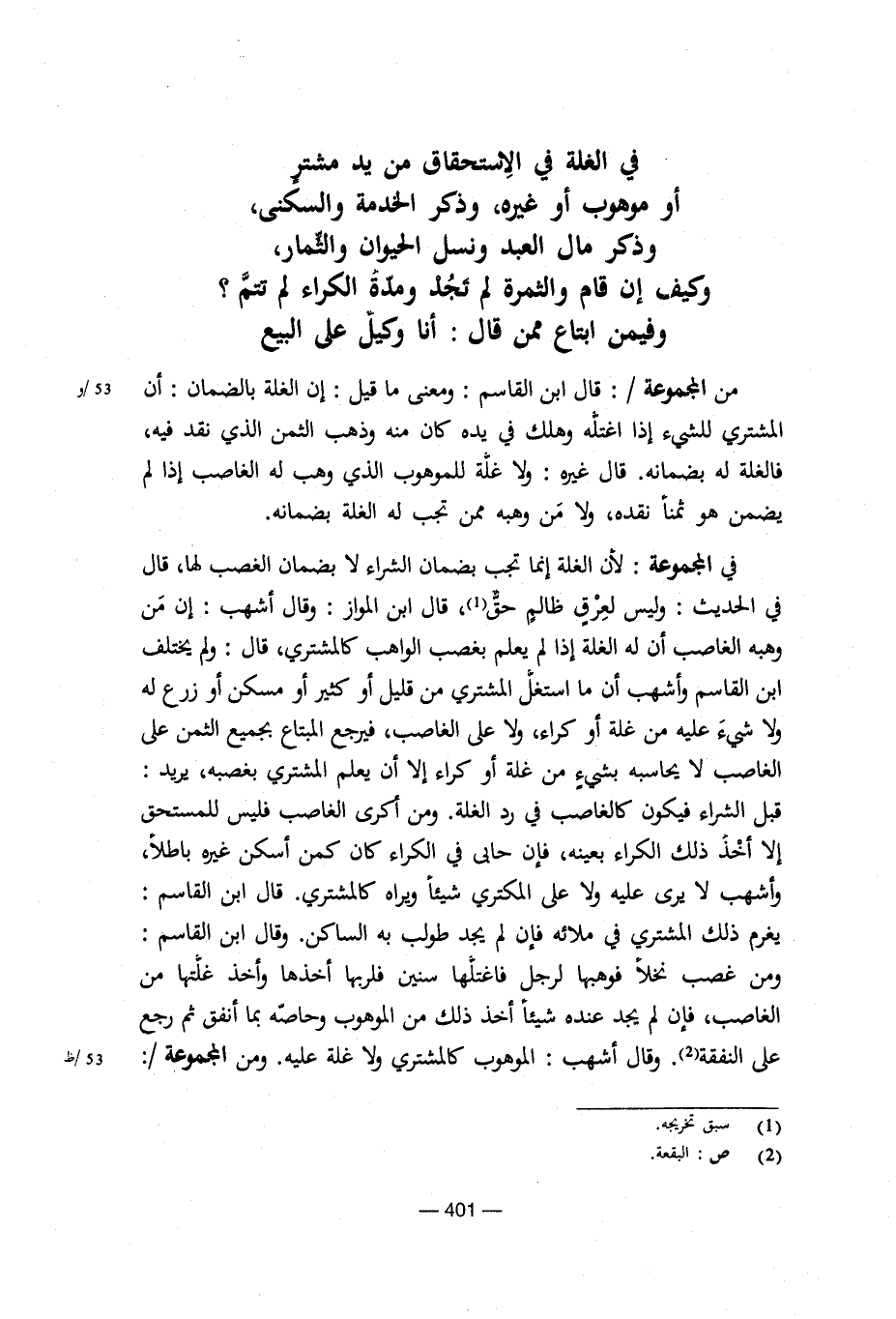 من المجموعة/: قال ابن القاسم: ومعنى ما قيل: إن الغلة بالضمان: أن المشتري للشيء إذا غتله هلك في يده كان منه وذهب الثمن الذي نقد فيه، فالغلة له بضمانه. قال غيره: ولا غلة للموهوب الذي وهب له الغاصب إذا لم يضمن هو ثمنا نقده، ولا من وهبه ممن تجب له الغلة بضمانه.