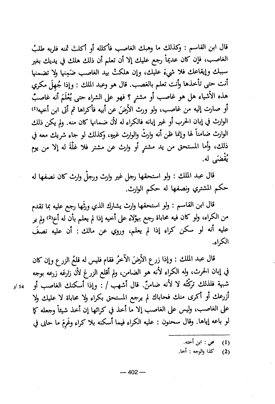 قال ابن القاسم: وكذلك ما وهبك الغاصب فأكلته أو أكلت ثمنه فلربه طلب الغاصب، فإن كان عديما رجع عليك إلا أن تعلم أن ذلك هلك في يديك بغير سببك وإيقاعك فلا شيء عليك، وإن هلكت بيد الغاصب ضمنها ولا تضمنها أنت حتى تأخذها وأنت تعلم بالغصب. قال هو وعبد الملك: وإذا جهل مكري هذه الأشياء هل هو غاصب أو مشتري؟ فهو على الشراء حتى يعلم أنه غاصب أو صارت إليه من غاصب، ولو ورث الأرض عن أبيه فأكراها ثم أتى ابن أخيه الوارث في إبان الحرب أو غير غبانه فالكراء له لأن ضمانها كان منه. ولم يكن ذلك الوارث ضامنا لها وإنما ظن أنه وارث والوارث غيره، وكذلك لو جاء شريك معه في ذلك، وأما المستحق من يد مشتر أو وارث عن مشتر فلا غلة له إلا من يوم يقضى له.