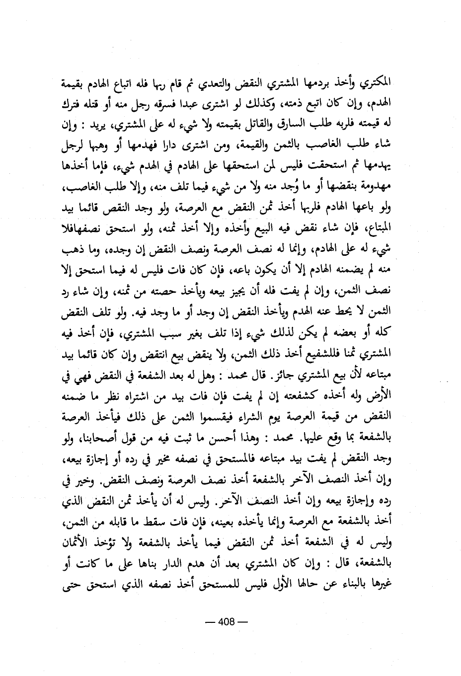 المكتري وأخذ بردمها المشتري النقض والتعدي ثم قام ربها فله أتباع الهادم بقيمة الهدم، وإن كان اتبع ذمته، وكذلك لو اشتري عبدا فسرقه رجل منه أو قتله فترك له قيمته فلربه طلب السارق والقاتل بقيمته ولا شيء له على المشتري، يريد: وإن شاء طلب الغاصب بالثمن والقيمة، ومن اشترى دارا فهدمها أو وهبها لرجل يهدمها ثم استحقت فليس لمن استحقها على الهادم في الهدم شيء، فإما أخذها مهدومة بنقضها أو ما وجد منه ولا من شيء فيما تلف منه، وإلا طلب الغاصب، ولو باعها الهادم فلربها اخذ ثمن النقض مع العرصة، ولو وجد النقص قائما بيد المبتاع، فإن شاء نقض فيه البيع وأخذه وإلا أخذ ثمنه، ولو استحق نصفها فلا شيء له على الهادم إلا أن يكون باعه، فإن كان فات فليس له فيما استحق إلا نصف الثمن، وإن لم يفت فله أن يجيز بيعه ويأخذ حصته من ثمنه، وإن شاء رد الثمن لا يحط عنه الهدم ويأخذ النقض إن وجد أو ما وجد فيه. ولو تلف النقض كله أو بعضه لم يكن لذلك شيء إذا تلف بغير سبب المشتري، فإن أخذ فيه المشتري ثمنا فللشفيع أخذ ذلك الثمن، ولا ينقض بيع انتقض وإن كان قائما بيد مبتاعه لأن بيع المشتري جائز. قال محمد وهل له بعد الشفعة في النقض فهي في الأرض وله أخذه كشفعته إن لم يفت فإن فات بيد من اشتراه نظر ما ضمنه النقض من قيمة العرصة يوم الشراء فيقسموا الثمن على ذلك فيأخذ العرصة بالشفعة بما وقع عليها. محمد: وهذا أحسن ما ثبت فيه من قول أصحابنا، ولو وجد النقض النصف الآخر بالشفعة أخذ نصف العرصة مخير في رده أو إجازة بيعه، وإن أخذ النصف الآخر بالشفعة آخذ نصف العرصة ونصف النقض. وخير في رده وإجازة بيعه وإن أخذ النصف الآخر. وليس له أن يأخذ ثمن النقض الذي أخذ بالشفعة مع العرصة وإنما يأخذه بعينه، فإن فات سقط ما قابله من الثمن، وليس له في الشفعة أخذ ثمن النقض فيما يأخذ بالشفعة ولا يؤخذ الأثمان بالشفعة، قال: وإن كان المشتري بعد أن هدم الدار بناها على ما كانت أو غيرها بالبناء عن حالها الأول فليس للمستحق أخذ نصفه الذي استحق حتى