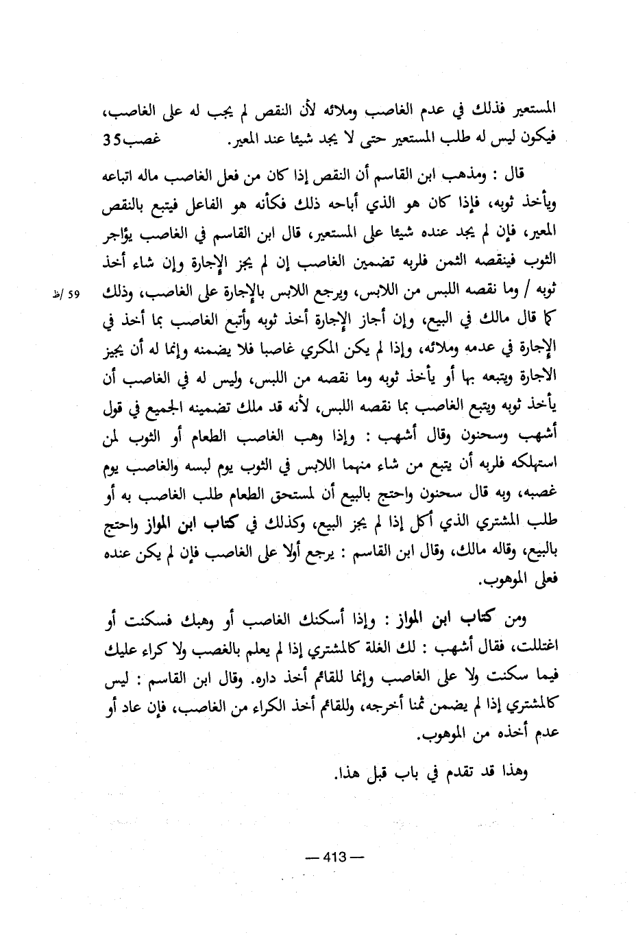 المستعير فذلك في عدم الغاصب وملائه لأن النقص لم يجب له على الغاصب، فيكون ليس له طلب المستعير حتى لا يجد شيئا عند المعير. غصب 35