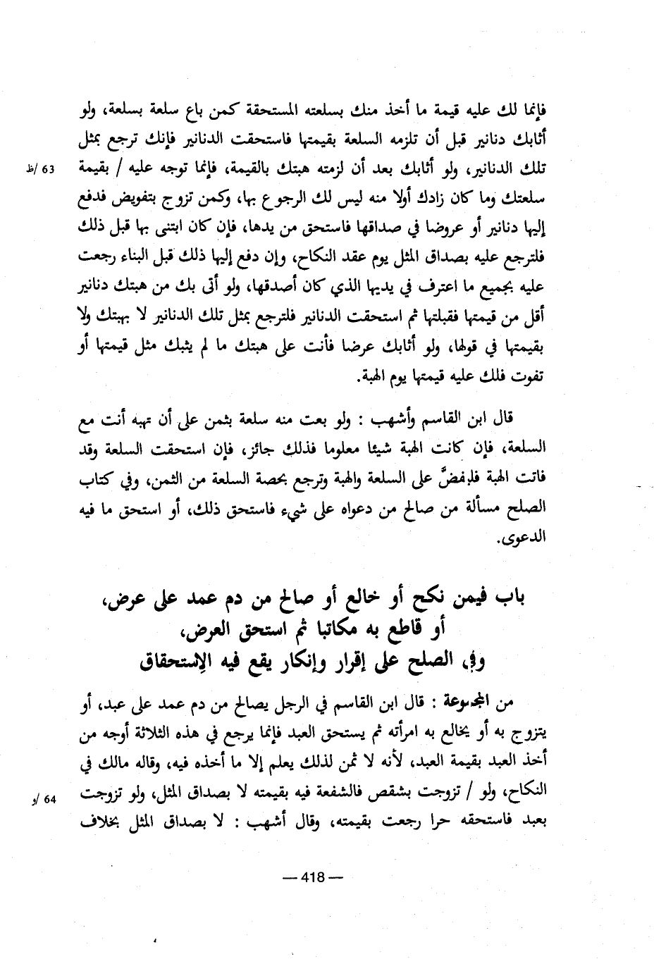 من المجموعة: قال ابن القاسم في الرجل يصالح من دم عمد على عبد، أو يتزوج به أو يخالع به امرأته ثم يستحق العبد فإنما يرجع في هذه الثلاثة أوجه من أخذ العبد بقيمة العبد، لأنه لا ثمن لذلك يعلم إلا ما أخذه فيه، وقاله مالك في النكاح، ولو/تزوجت بشقص فالشفعة فيه بقيمته لا بصداق المثل، ولو تزوجت بعبد فاستحقه حرا رجعت بقيمته، وقال أشهب: لا بصداق المثل بخلاف