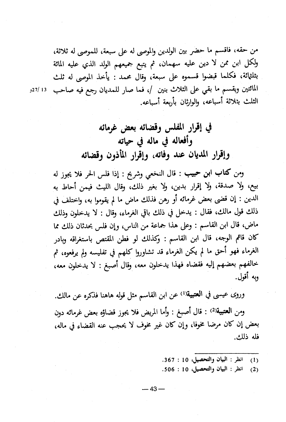 من حقه، فاقسم ما حضر بين الولدين والموصى له على سبعة، للموصي له ثلاثة، ولكل ابن ممن لا دين عليه سهمان، ثم يتبع جميعهم الولد الذي عليه المائة بثلاثمائة، فكلما قبضوا قسموه على سبعة، وقال محمد: يأخذ الموصى له ثلث المائتين ويقسم ما بقي على الثلاث بنين/، فما صار للمديان رجع فيه صاحب الثلث بثلاثة أسباعه، والوارثان بأربعة أسباعه.