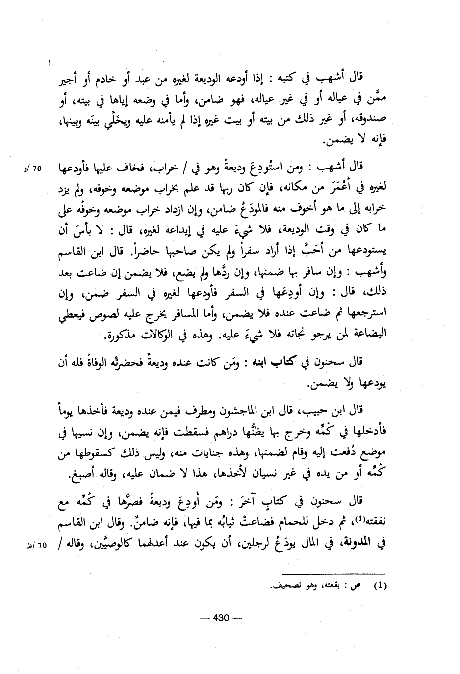 قال سحنون في كتاب آخر: ومن أودع وديعة فصرها في كمه مع نفقته، ثم دخل للحمام فضاعت ثيابه بما فيها، فإنه ضامن. وقال ابن القاسم في المدونة، في المال يودع لرجلين، أن يكون عند أعدلهما كالوصيين، وقاله/