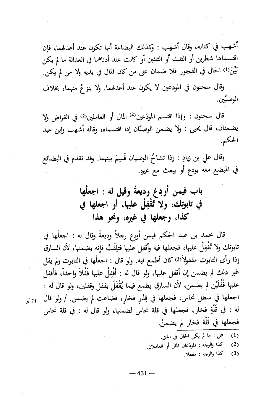 قال محمد بن عبد الحكم فيمن أودع رجلا وديعة وقال له: اجعلها في تابوتك ولا تقفل عليها، فجعلها فيه وأقفل عليها فتلفت فإنه يضمنها، لأن السارق إذا رأى التابوت مقفولا كان أطمع فيه. ولو قال: اجعلها في التابوت ولم يقل غير ذلك لم يضمن إن أقفل عليها، ولو قال له: أقفل عليها قفلا واحدا، فأقفل عليها قفلين لم يضمن، لأن السارق يطمع فيما يقفل بقفل وقفلين، ولو قال له: اجعلها في سطل نحاس، فجعلها في قدر فخار، فضاعت لم يضمن./ولو قال له: في قلة فخار، فجعلها في قلة نحاس لضمنها، ولو قال له: في قلة نحاس فجعلها في قلة فخار لم يضمن.