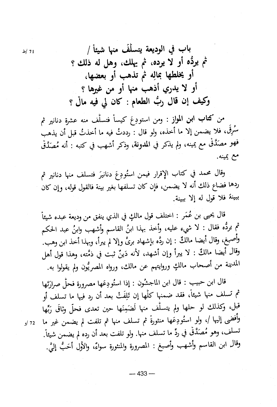 قال يحيى بن عمر: اختلف قول مالك في الذي ينفق من وديعة عبده شيئا ثم يرده فقال: لا شيء عليه، وأخذ بهذا ابن القاسم وأشهب وابن عبد الحكم وأصبغ، وقال أيضًا مالك: إن رده بإشهاد وإلا لم يبرأ، وبهذا أخذ ابن وهب. وقال أيضًا مالك: لا يبرأ وإن أشهد، لأنه دين ثبت في ذمته، وهذا قول أهل المدينة من أصحاب مالك وروايتهم عن مالك، ورواه المصريون ولم يقولوا به.