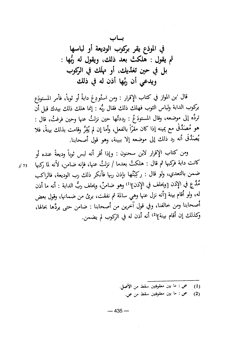 ومن كتاب الإقرار لابن سحنون: وإذا أقر أنه لبس ثوبا وديعة عنده أو كانت دابة فركبها ثم قالت: هلكت بعدما/نزلت عنها، فإنه ضامن، لأنه لما ركبها ضمن بالتعدي، ولو قال: ركبتها بإذن ربها فأنكر ذلك رب الوديعة، فالراكب مدع في الإذن [ويحلف في الإذن] وهو ضامن، ويحلف رب الدابة: أنه ما أذن له، ولو أقام بينة [أنه نزل عنها وهي سالمة ثم نفقت، برئ من ضمانها، وقول بعض أصحابنا ومن خالفنا، وفي قول آخرين من أصحابنا: ضامن حتى يردها بحالها، وكذلك إن أقام بينة] أنه أذن له في الركوب لم يضمن.