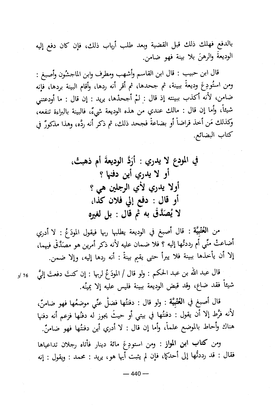 من العتبية: قال أصبغ في الوديعة يطلبها ربها فيقول المودع: لا أدري أضاعت مني أم رددتها إليه؟ فلا ضمان عليه لأنه ذكر أمرين هو مصدق فيهما، إلا أن يأخذها ببينة فلا يبرأ حتى يقيم ببينة: أنه ردها إليه، وإلا ضمن.