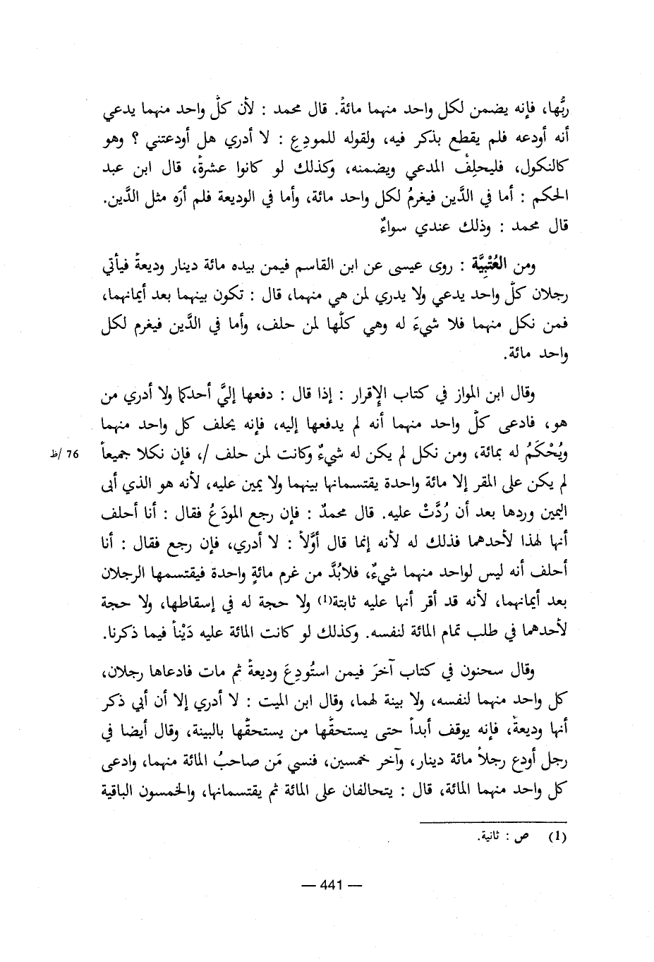 ومن العتبية: روى عيسى عن ابن القاسم فيمن بيده مائة دينار وديعة فيأتي رجلان كل واحد يدعي ولا يدري لم هي منهما، قال: تكون بينهما بعد أيمانها، فمن نكل منهما فلا شيء له وهي كله لمن حلف، وأما في الدين فيغرم لكل واحد مائة.