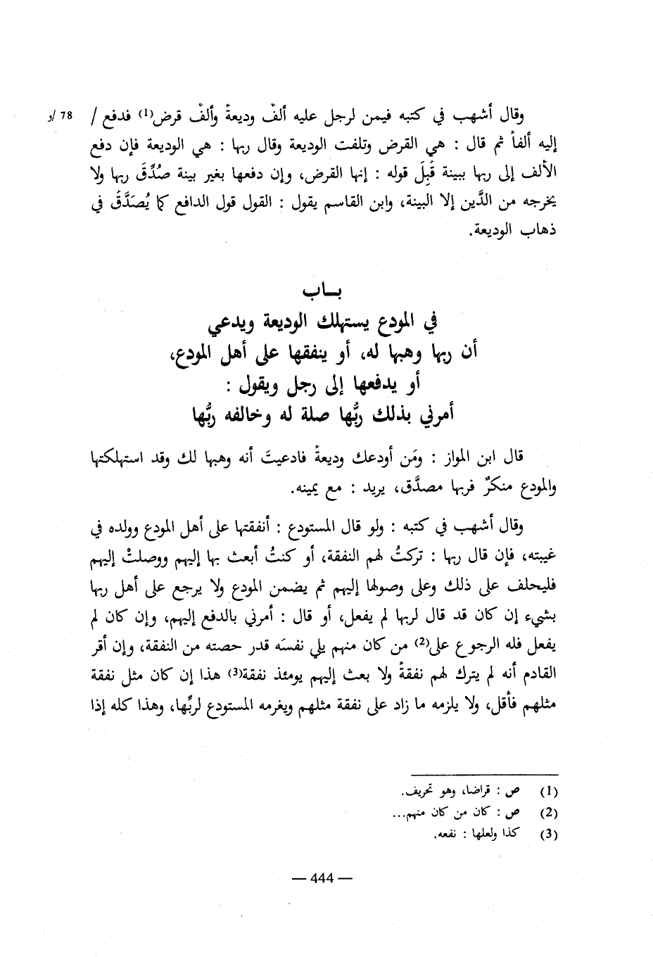 باب في المودع يستهلك الوديعة ويدعي أن ربها وهبها له، أو ينفقها على أهل المودع، أو يدفعها إلى رجل ويقول: أمرتي بذلك ربها صلة له وخالفه ربها