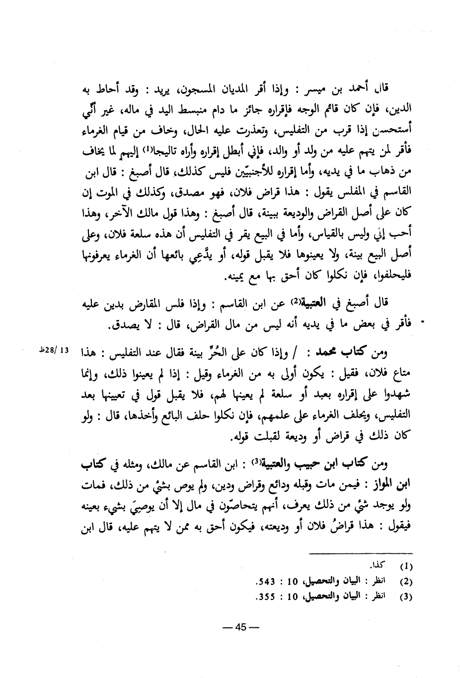 قال أحمد بن ميسير: وإذا أقر المديان المسجون، يريد: وقد أحاط به الدين، فإن كان قائم الوجه فإقراره جائز ما دام منبسط اليد في ماله، غير أني أستحسن إذا قرب من التفليس، وتعذرت عليه الحال، وخاف من قيام الغرماء فأقر لمن يتهم عليه من ولد أو والد، فإني أبطل إقراره وأراه تاليجا إليهم لما يخاف من ذهاب ما في يديه، وأما إقراره للأجنبيين فليس كذلك، قال أصبغ: قال ابن القاسم في المفلس يقول: هذا قراض فلان، فهو مصدق، وكذلك في الموت إن كان على أصل القراض والوديعة ببينة، قال أصبغ: وهذا قول مالك للآخر، وهذا أحب إلي وليس بالقياس، وأما في البيع يقر في التفليس أن هذه سلعة فلان، وعلى أصل البيع بينة، ولا يعينوها فلا يقبل قوله، أو يدعي بائعها أن الغرماء يعرفونها فليحلفوا، فإن نكلوا كان أحق بها مع يمينه.