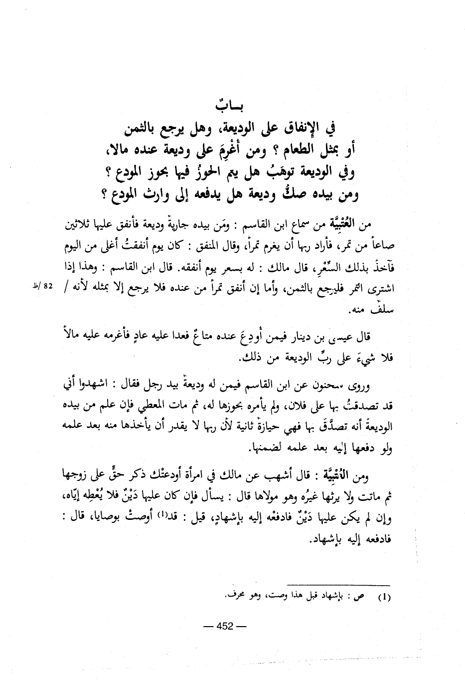 باب في الإنفاق على الوديعة، وهل يرجع بالثمن أو بمثل الطعام؟ ومن أغرم على وديعة عنده مالا، وفي الوديعة توهب هل يتم الحوز فيها بحوز المودع؟