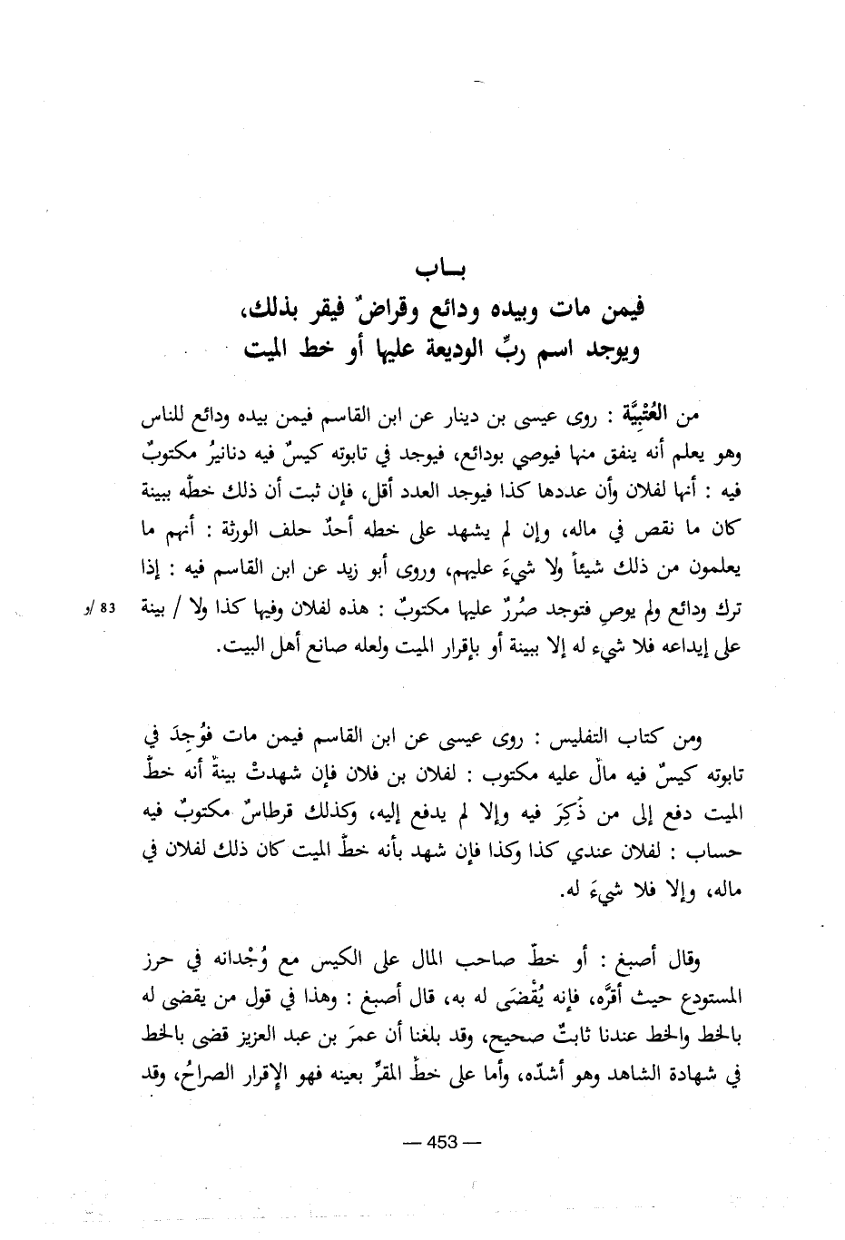 من العتبية: روى عيسى بن دينار عن ابن القاسم فيمن بيده ودائع للناس وهو يعلم أنه ينفق منها فيوصي بودائع، فيوجد في تابوته كيس فيه دنانير مكتوب فيه: أنها لفلان وأن عددها كذا فيوجد العدد أقل، فإن ثبت أن ذلك خطه ببينة كان ما نقص في ماله، وإن لم يشهد على خطه أحد حلف الورثة: أنهم ما يعلمون من ذلك شيئا ولا شيء عليهم، وروى أو زيد عن ابن القاسم فيه: إذا ترك ودائع ولم يوص فتوجد صرر عليها مكتوب: هذه لفلان وفيها كذا ولا/بينة على إيداعه فلا شيء له إلا ببينة أو بإقرار الميت ولعله صانع أهل البيت.