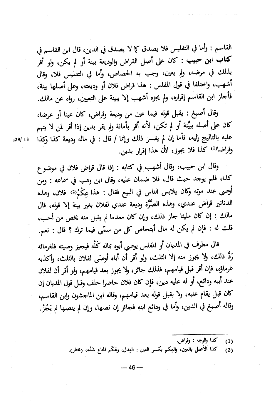 القاسم: وأما في التفليس فلا يصدق كما لا يصدق في الدين، قال ابن القاسم في كتاب ابن حبيب: كان على أصل القراض والوديعة بينة أو لم يكن، ولو أقر بذلك في مرضه، ولم يعين، وجب به الحصاص، وأما في التفليس فلا، وقال أشهب، واختلفا في قول المفلس: هذا قراض فلان أو وديعته، وعلى أصلها بينة، فأجاز ابن القاسم إقراره، ولم يجزه أشهب إلا ببينة على التعيين، رواه عن مالك.