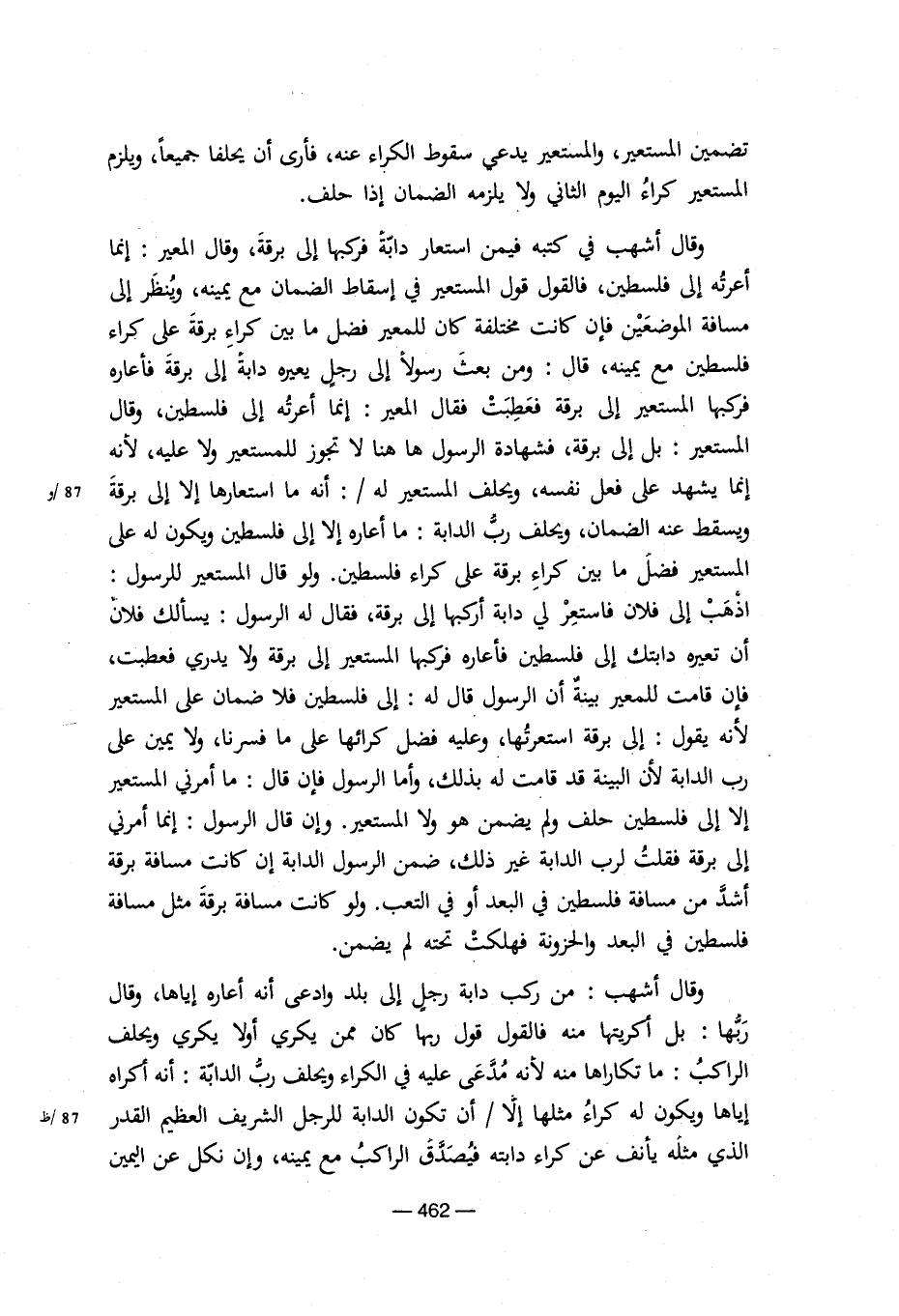 وقال أشهب في كتبه فيمن استعار دابة فركبها إلى برقة، وقال المعير: إنما أعرته إلى فلسطين، فالقول قول المستعير في إسقاط الضمان مع يمينه، وينظر إلى مسافة الموضعين فإن كانت مختلفة كان للمعير فضل ما بين كراء برقة على كراء فلسطين مع يمينه، قال: ومن بعث وسولا إلى رجل يعيره دابة إلى برقة فأعاره فركبها المستعير إلى برقة فعطبت فقال المعير: إنما أعرته إلى فلسطين، وقال المستعير: بل إلى برقة، فشهادة الرسول ها هنا لا تجوز للمستعير ولا عليه، لأنه إنما يشهد على فعل نفسه، ويحلف المستعير له/: أنه ما استعارها إلا إلى برقة ويسقط عنه الضمان، ويحلف رب الدابة: ما أعاره إلا إلى فلسطين ويكون له على المستعير فضل ما بين كراء برقة على كراء فلسطين. ولو قال المستعير للرسول: اذهب إلى فلان فاستعر لي دابة أركبها إلى برقة، فقال له الرسول: يسألك فلان أن تعيره دابتك إلى فلسطين فأعاره فركبها المستعير إلى برقة لا يدري فعطبت، فإن قامت للمعير بينة أن الرسول قال له: إلى فلسطين فلا ضمان على المستعير لأنه يقول: إلى برقة استعرتها، وعليه فضل كرائها على ما فسرنا، ولا يمين على رب الدابة لأن البينة قد قامت له بذلك، وأما الرسول فإن قال: ما أمرني المستعير إلا إلى فلسطين حلف ولم يضمن هو وال المستعير. وإن قال الرسول: إنما أمرني إلى برقة فقلت لرب الدابة غير ذلك، ضمن الرسول الدابة إن كانت مسافة برقة أشد من مسافة فلسطين في البعد أو في التعب. ولو كانت مسافة برقة مثل مسافة فلسطين في البعد والخزونة فهلكت تحته لم يضمن.