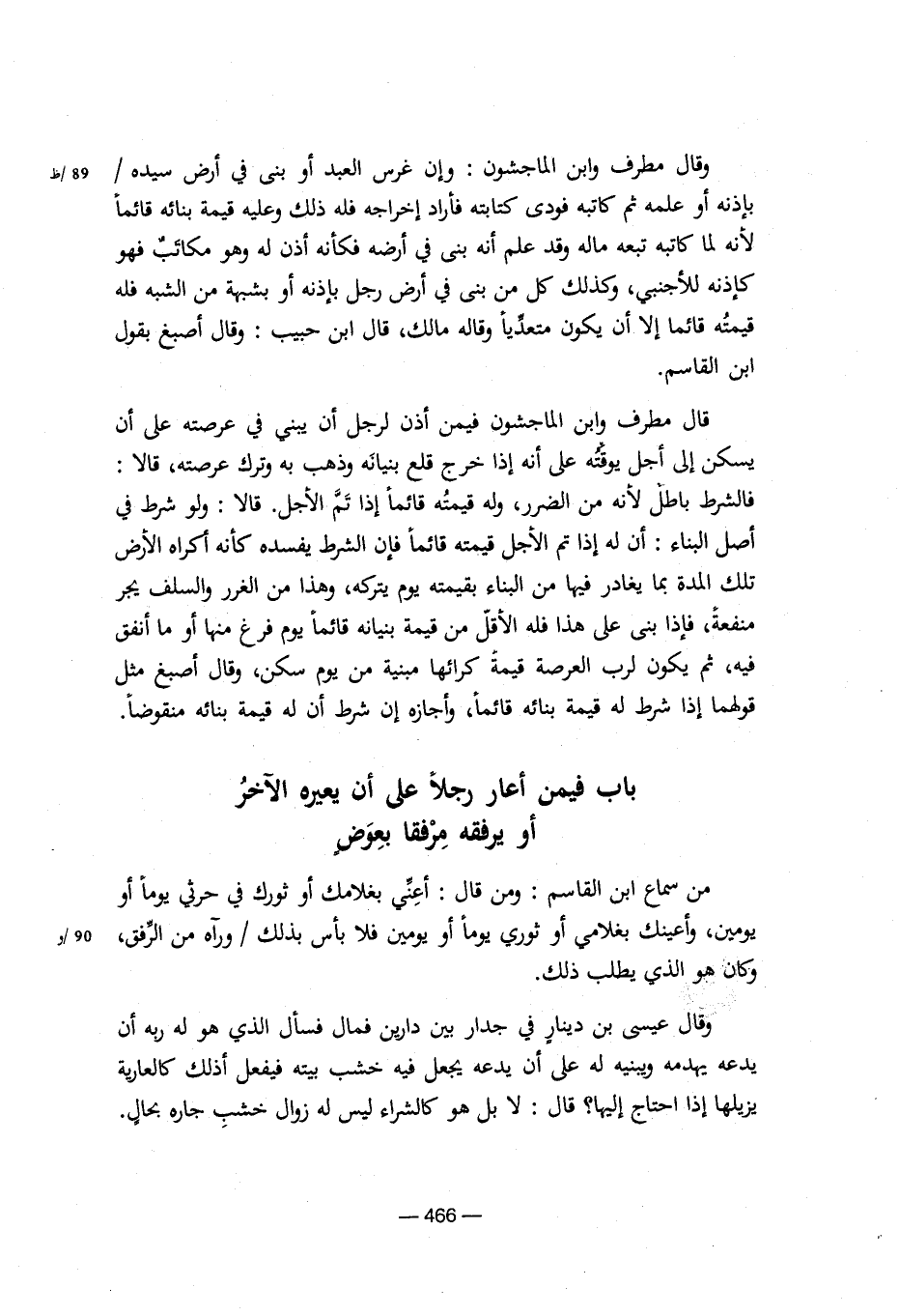 وقال عيسى بن دينار في جدار بين دارين فمال فسأل الذي هو له ربه أن يدعه يهدمه ويبنيه له على أن يدعه يجعل فيه خشب بيته فيفعل أذلك كالعارية يزيلها إذا احتاج إليها؟ قال: لا بل هو كالشراء ليس له زوال خشب جاره بحال.