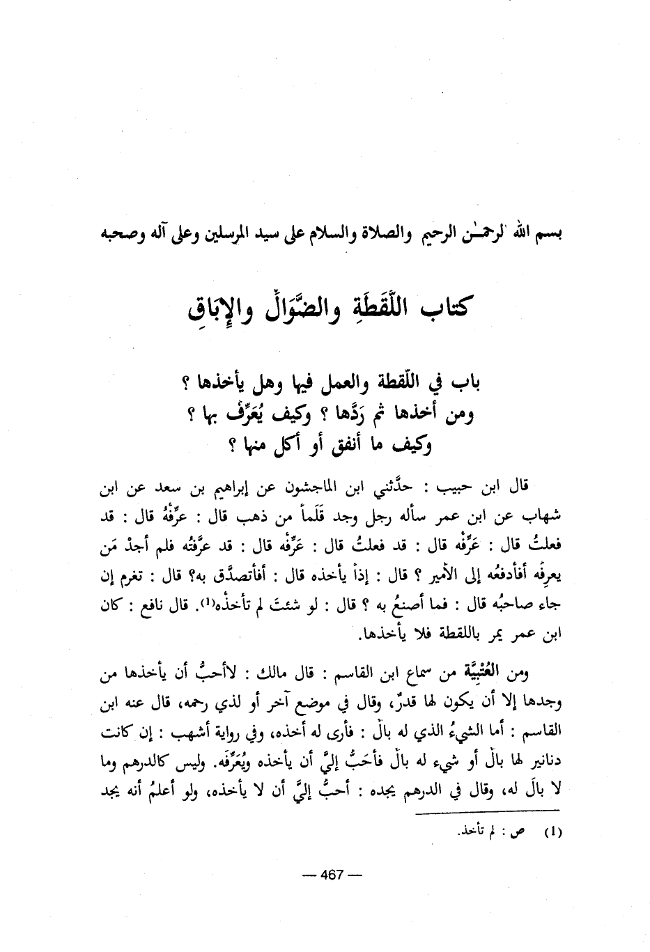 قال ابن حبيب: حدثني ابن الماجشون عن إبراهيم بن سعد عن ابن شهاب عن ابن عمر سأله رجل وجد قلما م ذهب قال: عرفه قال: قد فعلت قال: عرفه قال: قد فعلت قال: عرفه قال: قد عرفته فلم أجد من يعرفه أفأدفعه إلى الأمير؟ قال: إذا يأخذه قال: أفأتصدق به؟ قال: تغرم إن جاء صاحبه قال: فما أصنع به؟ قال: لو شئت لم تأخذه. قال نافع: كان ابن عمر باللقطة فلا يأخذها.