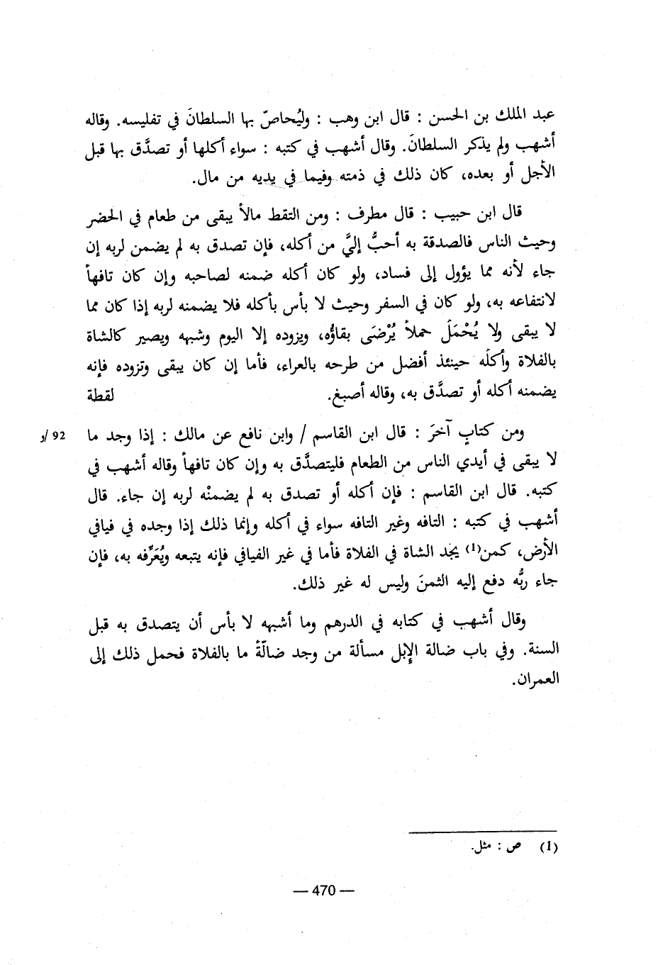 وقال أشهب في كتابه في الدرهم وما أشبهه لا بأس أن يتصدق به قبل السنة. وفي باب ضالة الإبل مسألة من وجد ضالة ما بالفلاة فحمل ذلك إلى العمران.