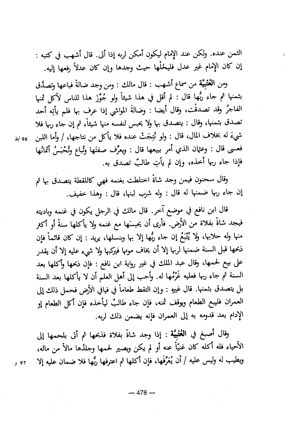 قال ابن نافع في موضع آخر. قال مالك في الرجل يكون في غنمه وباديته فيجد شاة بفلاة من الأرض. فأرى أن يحبسها مع غنمه ولا يأكلها سنة أو أكثر منها وله حلابها، ولا يتبع إن جاء ربها إلا بها وبنسلها، يريد: إن كان قائما فإن ذبحها قبل السنة ضمنها لربها إلا أن يخاف موتها فيركبها ولا شيء عليه إلا أن يقدر على بيع لحمها، وقال عبد الملك في غير رواية ابن نافع: فإن ذبحها وأكلها بعد السنة ثم جاء ربها فعليه غرمها له. وأحب إلى أهل العلم أن لا يأكلها بعد السنة بل يتصدق بثمنها. قال غيره: وإن التقط طعاما في فيافي الأرض فحمل ذلك إلى العمران فليبع الطعام ويوقف ثمنه، فإن جاء طالب ليأخذه فإن أكل الطعام أو الإدام بعد قدومه به إلى العمران فإنه يضمن ذلك لربه.