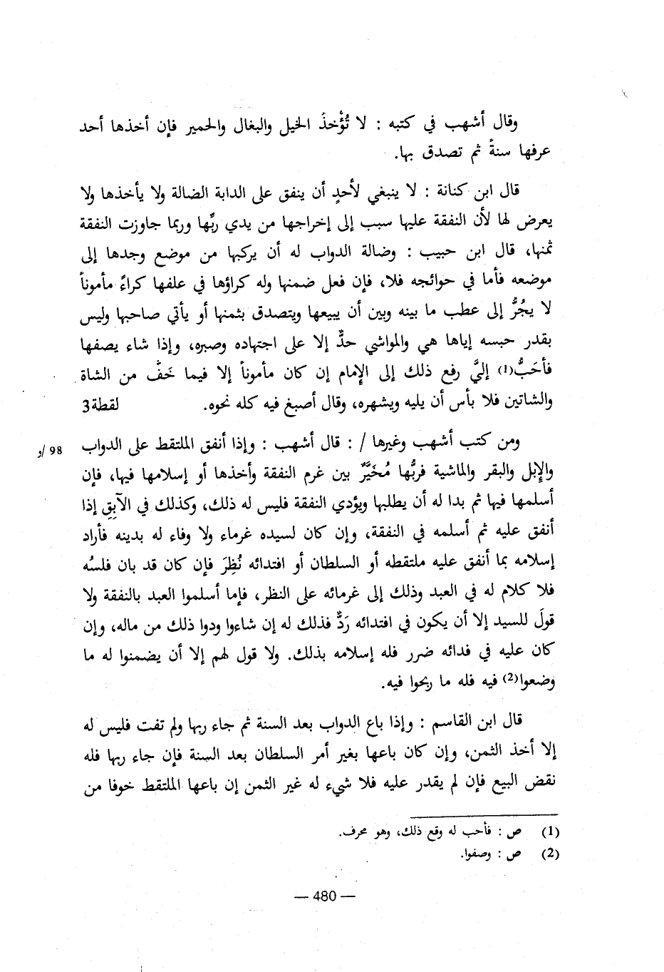 قال ابن كنانة: لا ينبغي لأحد أن ينفق على الدابة الضالة ولا يأخذها ولا يعرض لها لأن النفقة عليها سبب إلى إخراجها من يدي ربها وربما جاوزت النفقة ثمنها، قال ابن حبيب: وضالة الدواب له أن يركبها من موضع وجدها إلى موضعه فأما في حوائجه فلا، فإن فعل ضمنها وله كراؤها في علفها كراء مأمونا لا يجر إلى عطب ما بينه وبين أن يبيعها ويتصدق بثمنها أو يأتي صاحبها وليس بقدر حبسه إياها هي والمواشي حد إلا على اجتهاده وصبره، وإذا شاء يصفها فأحب إلي رفع ذلك إلى الإمام إن كان مأمونا إلا فيما خف من الشاة والشاتين فلا بأس أن يليه ويشهره، وقال أصبغ فيه كله نحوه. لقطة 3