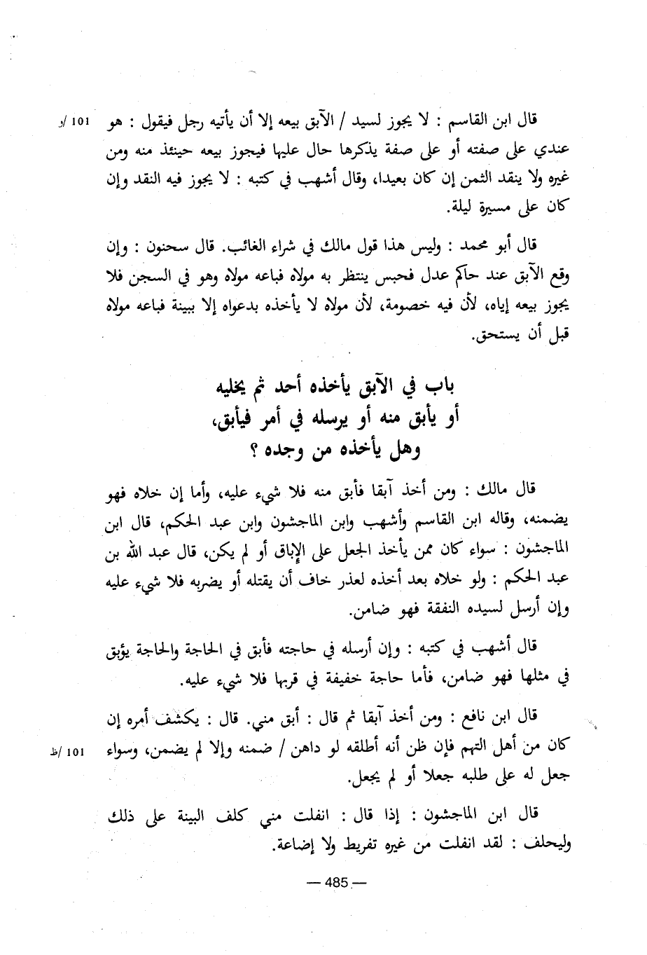 قال ابن القاسم: لا يجوز لسيد/الآبق بيعه إلا أن يأتيه رجل فيقول: هو عندي على صفته أو على صفة يذكرها حال عليها فيجوز بيعه حينئذ منه ومن غيره ولا ينقد الثمن إن كان بعيدا، وقال أشهب في كتبه: لا يجوز فيه النقد وإن كان على مسيرة ليلة.