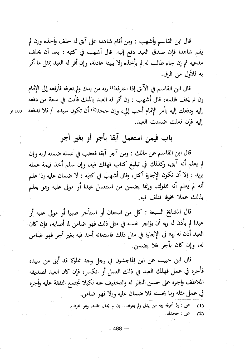 قال ابن القاسم وأشهب: ومن أقام شاهدا على آبق له حلف وأخذه وإن لم يقم شاهدا فإن صدق العبد دفع إليه. قال أشهب في كتبه: بعد أن يحلف مدعيه ثم إن جاء طالب له لم يأخذه إلا ببينة عادلة، وإن أقر له العبد بمثل ما أقر به للأول من الرق.