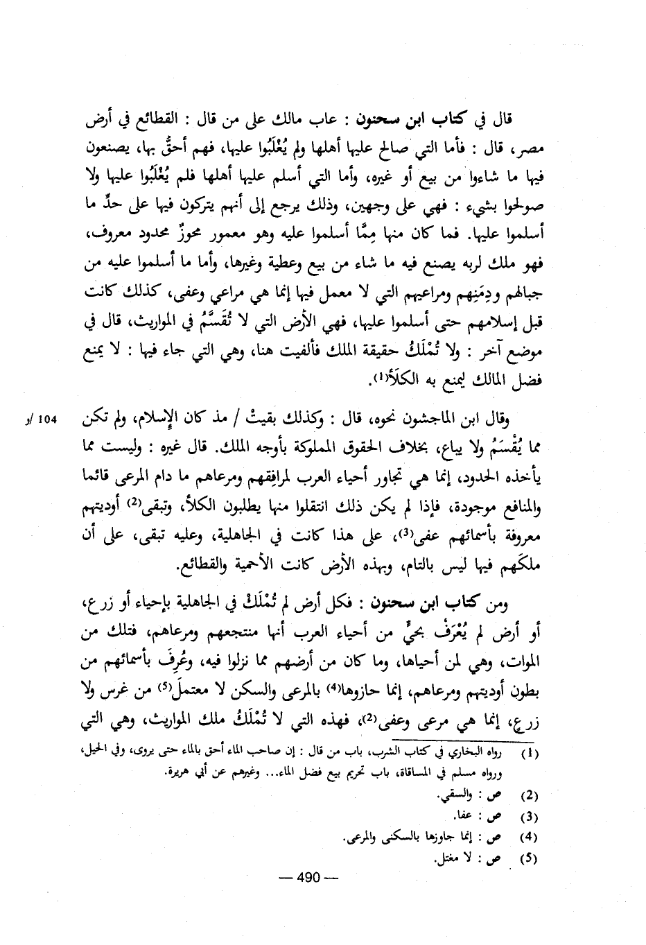 قال في كتاب ابن سحنون: عاب مالك على من قال: القطائع في أرض مصر، قال: فأما التي صلاح عليها أهلها ولم يغلبوا عليها، فهم أحق بها، يصنعون فيها ما شاءوا من بيع أو غيره، وأما التي أسلم عليها أهلها فلم يغلبوا عليها ولا صولحوا بشيء: فهي على رجلين، وذلك يرجع إلى أنهم يتركون فيها على حد ما أسلموا عليها. فما كان منها مما أسلموا عليه وهو معمور محوز محدود معروف، فهو ملك لربه يصنع فيه ما شاء من بيع وعطية وغيرها، وأما ما أسلموا عليه من جبالهم ودمنهم ومراعيهم التي لا معمل فيها إنما هي مراعي وعفى، كذلك كانت قبل إسلامهم حتى أسلموا عليها، فهي الأرض التي لا تقسم في المواريث، قال في موضع آخر: ولا تملك حقيقة الملك فألفيت هنا، وهي التي جاء فيها: لا يمنع فضل المالك ليمنع به الكلأ.