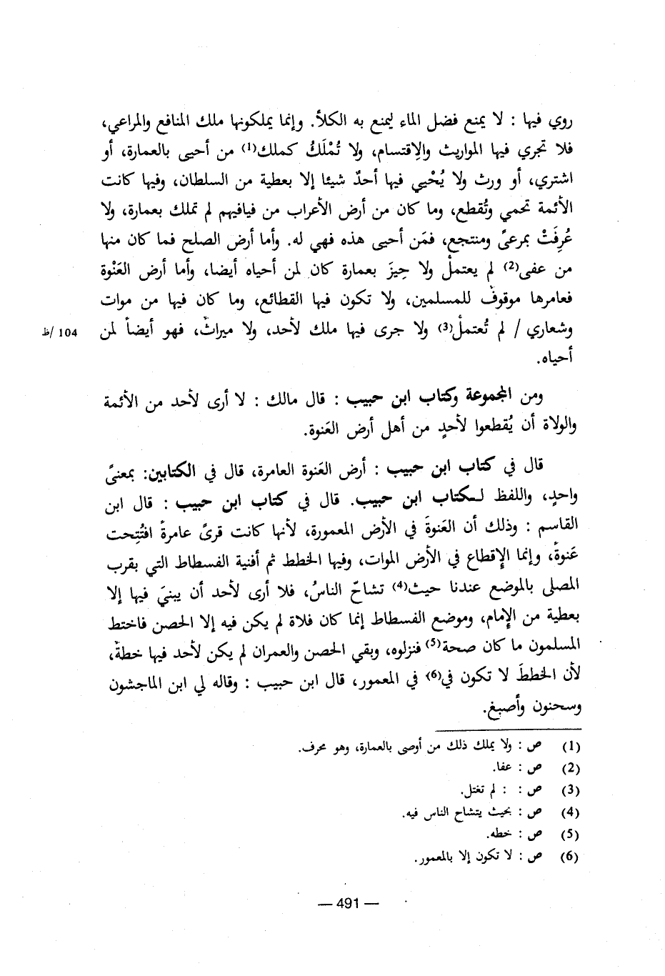 قال في كتاب ابن حبيب: أرض العنوة العامرة، قال في الكتابين: بمعنى واحد، واللفظ لكتاب ابن حبيب. قال في كتاب ابن حبيب: قال ابن القاسم: وذلك أن العنوة في الأرض المعمورة، لأنها كانت قرى عامرة افتتحت عنوة، وإنما الإقطاع في الأرض الموات، وفيها الخطط ثم أفنية الفسطاط التي بقرب المصلى بالموضع عندنا حيث تشاح الناس، فلا أرى لأحد أن يبني فيها إلا بعطية من الإمام، وموضع الفسطاط إنما كان فلاة لم يكن فيه إلا الحصن فاختط المسلمون ما كان صحة فنزلوه، وبقي الحصن والعمران لم يكن لأحد فيها خطة، لأن الخطط لا تكون في المعمور، قال ابن حبيب: وقاله لي ابن الماجشون وسحنون وأصبغ.