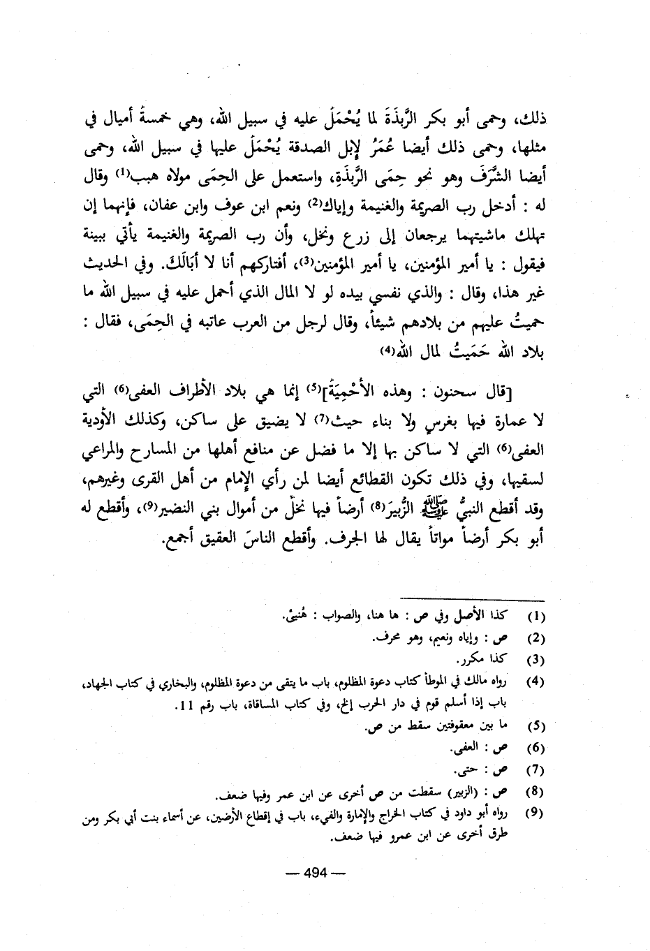 [قال سحنون: وهذه الأحمية] إنما هي بلاد الأطراف العفى التي لا عمارة فيها بغرس ولا بناء حيث لا يضيق على ساكن، وكذلك الأودية العفى التي لا ساكن بها إلا ما فضل عن منافع أهلها من المسارح والمراعي لسقيها، وفي ذلك تكون القطائع أيضًا لمن رأى الإمام من أهل القرى وغيرهم، وقد أقطع النبي صلى الله عليه وسلم الزبير أرضا فيها نخل من أموال بني النضير، وأقطع له أبو بكر أرضا مواتا يقال لها الجرف. وأقطع الناس العقيق أجمع.