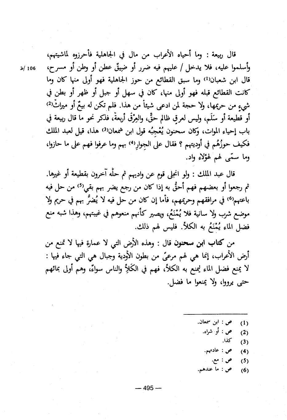 من كتاب ابن سحنون قال: وهذه الأرض التي لا عمارة فيها لا تمنع من أرض الأعراب، إنما هي لهم مرعى من بطون الأودية وجبال هي التي جاء فيها: لا يمنع فضل الماء ليمنع به الكلأ، فهم في الكلأ والناس سواء، وهم أولى بمائهم حتى يرووا، ولا يمنعوا ما فضل.
