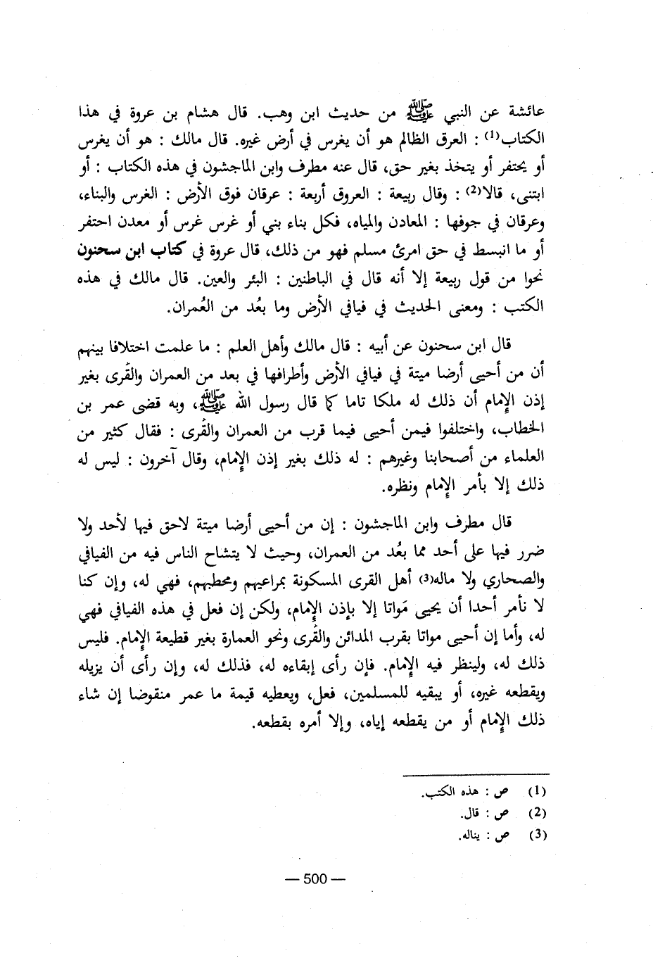 عائشة عن النبي صلى الله عليه وسلم من حديث ابن وهب. قال هشام بن عروة في هذا الكتاب: العرق الظالم هو أن يغرس في أرض غيره. قال مالك: هو أن يغرس أو يحتفر أو يتخذ بغير حق، قال عنه مطرف وابن الماجشون في هذه الكتاب: أو ابتنى، قالا: وقال ربيعة: العروق أربعة: عرقان فوق الأرض: الغرس والبناء، وعرقان في جوفها: المعادن والمياه، فكل بناء بني أو غرس غرس أو معدن احتفر أو ما انبسط في حق امرئ مسلم فهو من ذلك، قال عروة في كتاب ابن سحنون نحوا من قول ربيعة إلا أنه قال في الباطنين: البئر والعين. قال مالك في هذه الكتب: ومعنى الحديث في فيافي الأرض وما بعد من العمران.