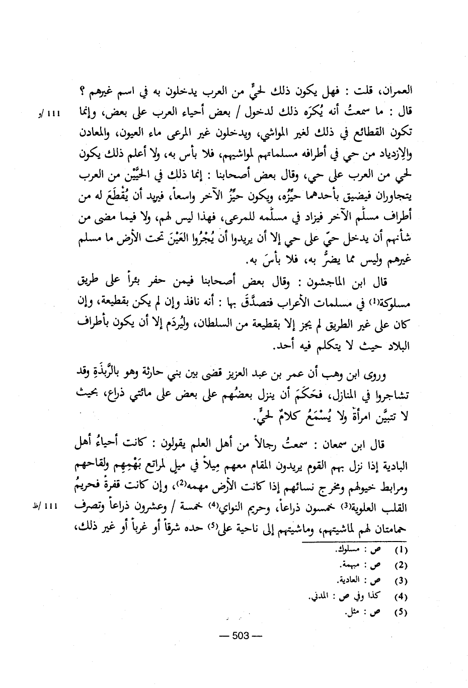 العمران، قلت: فهل يكون ذلك لحي من العرب يدخلون به في اسم غيرهم؟ قال: ما سمعت أنه يكره ذلك لدخول/بعض أحياء العرب على بعض، وإنما تكون القطائع في ذلك لغير المواشي، ويدخلون غير المرعى ماء العيون، والمعادن والازدياد من حي في أطرافه مسلماتهم لمواشيهم، فلا بأس به، ولا أعلم ذلك يكون لحي من العرب على حي، وقال بعض أصحابنا: إنما ذلك في الحيين من العرب يتجاوران فيضيق بأحدهما حيزه، ويكون حيز الآخر واسعا، فيريد أن يقطع له من أطراف مسلم الآخر فيزاد في مسلمه للمرعى، فهذا ليس لهم، ولا فيما مضى من شأنهم أن يدخل حي على حي إلا يريدوا أن يجروا العين تحت الأرض ما مسلم غيرهم وليس مما يضر به، فلا بأس به.