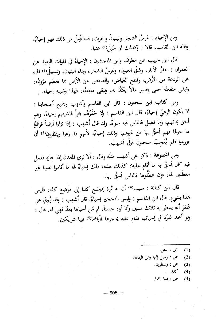 ومن كتاب ابن سحنون: قال ابن القاسم وأشهب وجميع أصحابنا لا يكون الرعي إحياء، قال ابن القاسم: ولا حفرهم بئرا لماشيتهم إحياء، وهم أحق بمائهم، وما فضل فالناس فيه سواء. وقد قال أشهب: إذا نزلوا أرضا فرعوا ما حولها فهم أحق بها من غيرهم، وذلك إحياء، لأنهم قد راعوا وينظرون أن يزرعوا فلم يعجب سحنون قول أشهب.