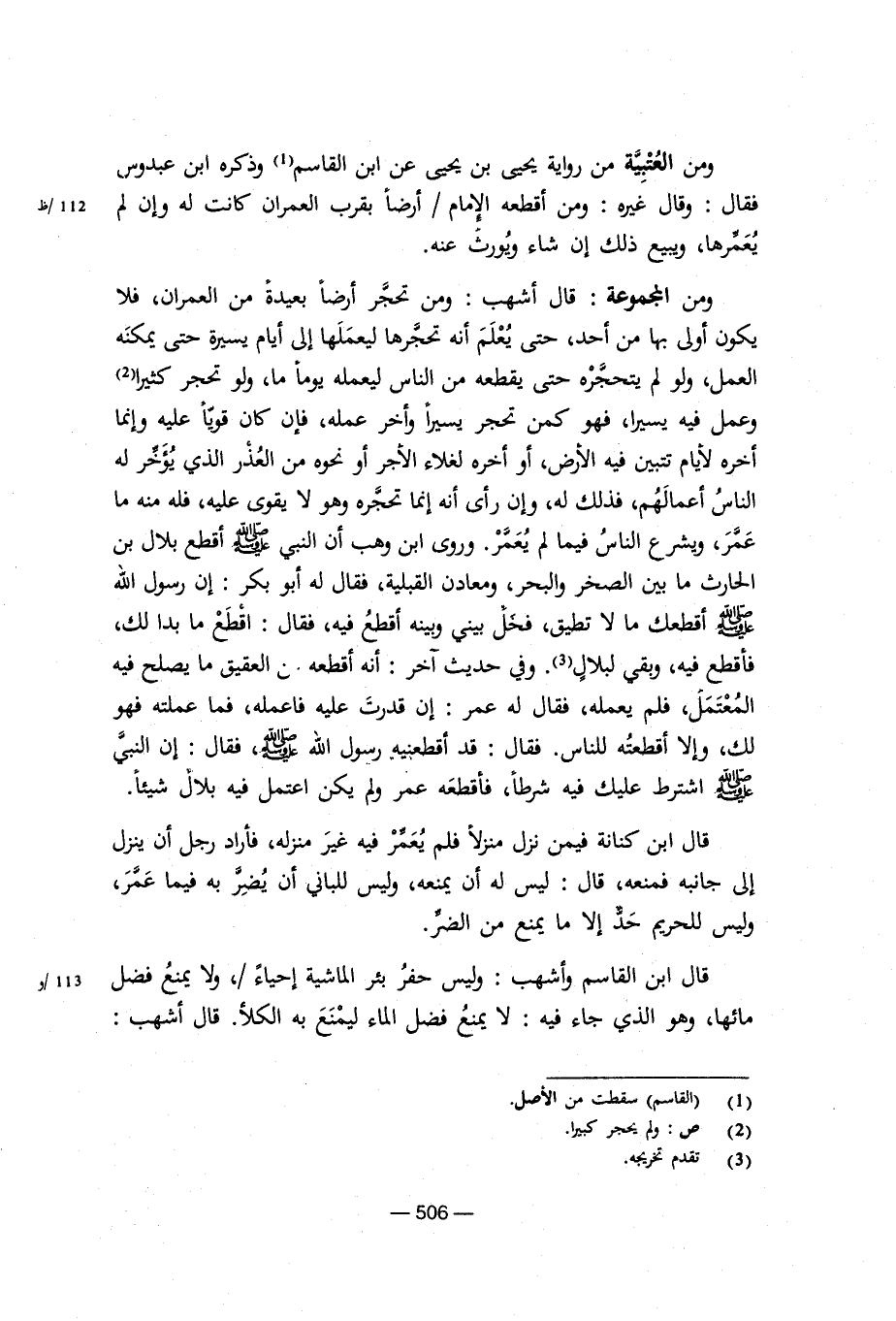 ومن العتبية م رواية يحيى بن يحيى عن ابن القاسم وذكره ابن عبدوس فقال: وقال غيره: ومن أقطعه الإمام/أرضا بقرب العمران كانت له وإن لم يعمرها، ويبيع ذلك إن شاء ويورث عنه.