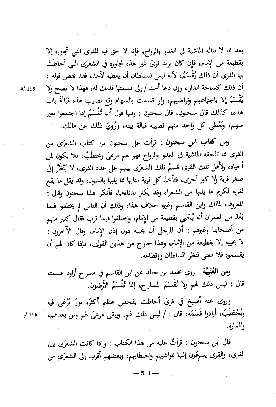 ومن كتاب ابن سحنون: قرأت على سحنون من كتاب الشعري من القرى مما تلحقه الماشية في الغدو والرواح فهو لهم مرعى ومحتطب ن فلا يكون لمن أحياه، ولأهل تلك القرى قسم تلك الشعري بينهم على عدد القرى، لا ينظر إلى صغر قرية ولا كبر أخرى، فتأخذ كل قرية منابها مما يليها بالسواء، وقد يقل ما يقع لقرية لكريم ما يليها من الشعراء وقد يكثر لدناءتها، فأنكر هذا سحنون وقال: المعروف لمالك وابن القاسم وغيره خلاف هذا، وذلك أن الناس لم يختلفوا فيما بعد من العمران أنه يحيى بقطيعة من الإمام، واختلفوا فيما قرب فقال كثير منهم من أصحابنا وغيرهم: أن للرجل أن يحييه دون إذن الإمام، وقال الآخرون: لا يحييه إلا بقطيعة من الإمام، وهذا خارج من هذين القولين، فإذا كان لهم أن يقسموه فلا معنى لنظر السلطان وإقطاعه.